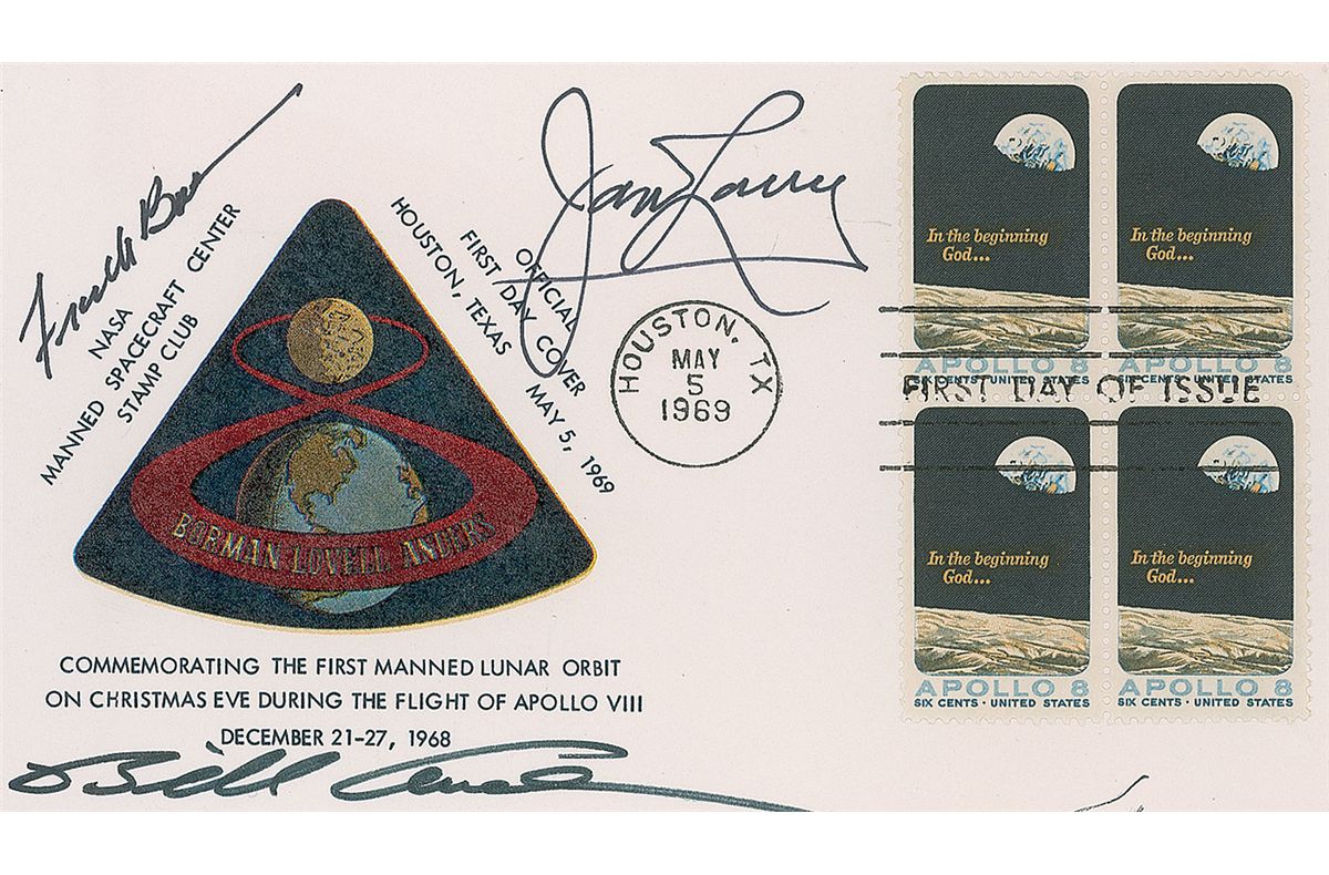 FDC from the NASA Manned Spacecraft Center Stamp Club with a cachet of the mission’s logo, signed in black felt tip by Frank Borman, James Lovell, and Bill Anders. In very fine, clean, bright condition.