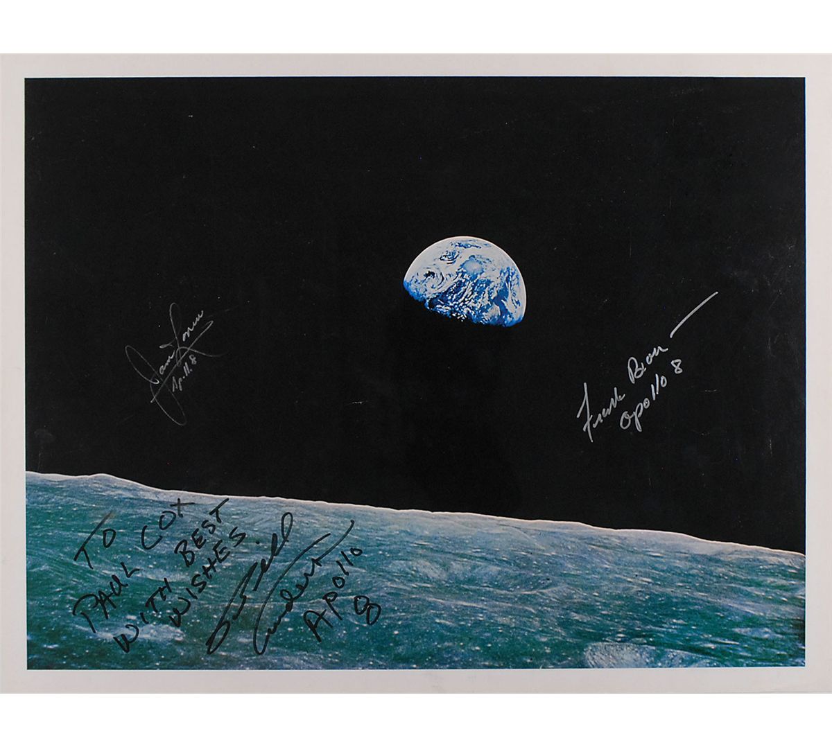 Breathtaking color 22 x 17 photographic print, featuring the earth rising from the lunar surface, signed and inscribed in black felt tip, “To Paul Cox, With Best Wishes, Bill Anders, Apollo 8,” and signed in silver ink, “James Lovell, Apollo 8,” and “Frank Borman, Apollo 8.” Scattered creases to the dark background and a few edge dings, otherwise fine condition. Rolled.
