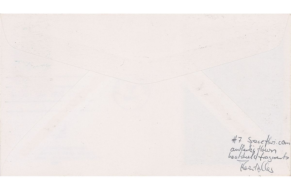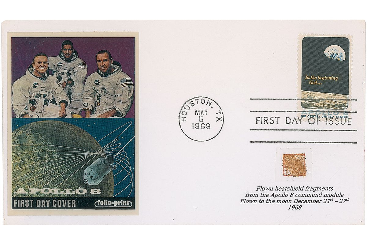 A .25 x .25 fragment of heat shield from the Apollo 8 Command Module, flown to the moon in December of 1968. Swatch is affixed to an FDC with an affixed color cachet honoring the Apollo 8 crew and mission. In fine condition.