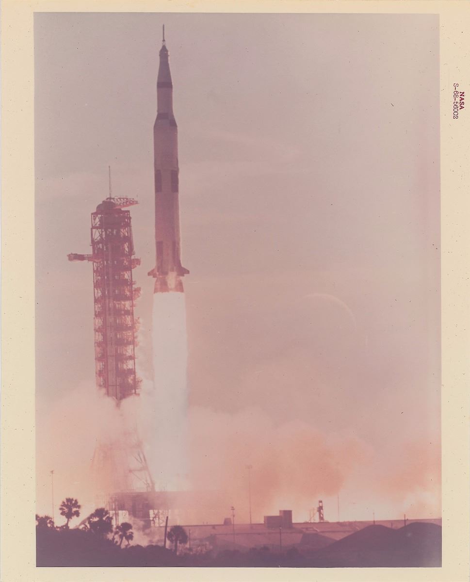 Rare unsigned glossy official 8 x 10 red-numbered NASA photo of the Apollo 8 liftoff, serial “S-68-56002,” with the crescent moon seen in the distance. Reverse bears “A Kodak Paper” watermarks. In fine condition.