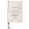 Highly appealing program for a New York State Dinner honoring the crew of Apollo 8 at the Waldorf–Astoria on January 10, 1969, 6 x 8.5, with embossed moon on front and menu inside, signed on the front cover in black felt tip by James Lovell and Bill Anders, and in blue ballpoint by Frank Borman. Includes the original patriotic cord. In fine condition, with light toning along the right edge. Consignor notes that the signatures were obtained by Michael Strunk, a Waldorf-Astoria employee who worked in the banquet department during the 1950s and 1960s.