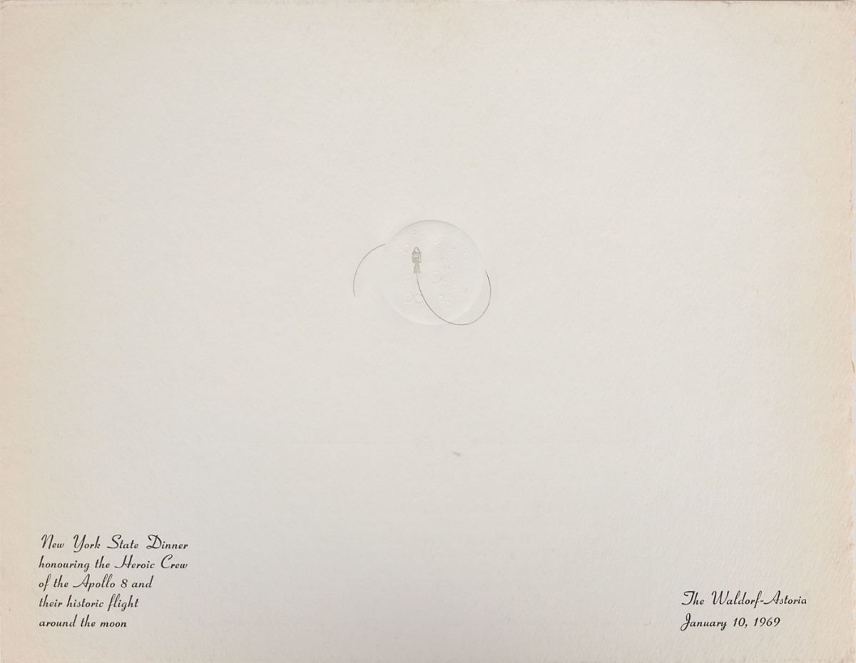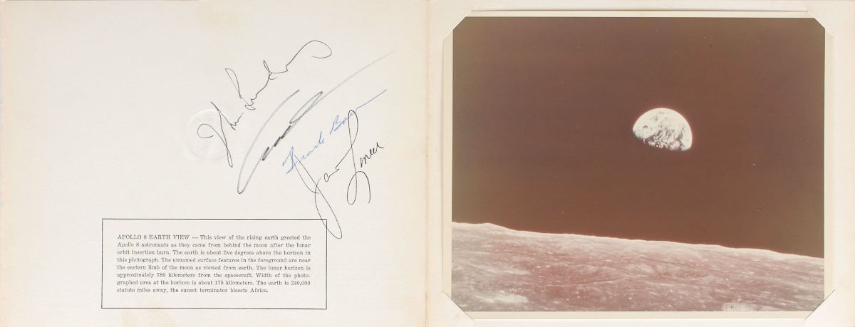 Brilliant official color glossy 10 x 8 NASA photo of the famous ‘Earthrise’ photo from the first manned mission to orbit the moon. Housed in its original Waldorf-Astoria display folder, measuring 22 x 8.5 open, presented at a New York State Dinner in honor of the Apollo 8 crew on January 10, 1969, signed on the inner gatefold opposite the photo in black felt tip by New York Mayor John Lindsay, Bill Anders, and James Lovell, and in blue ballpoint by Frank Borman. In fine condition, with light toning along the right edge. Consignor notes that the signatures were obtained by Michael Strunk, a Waldorf-Astoria employee who worked in the banquet department during the 1950s and 1960s.