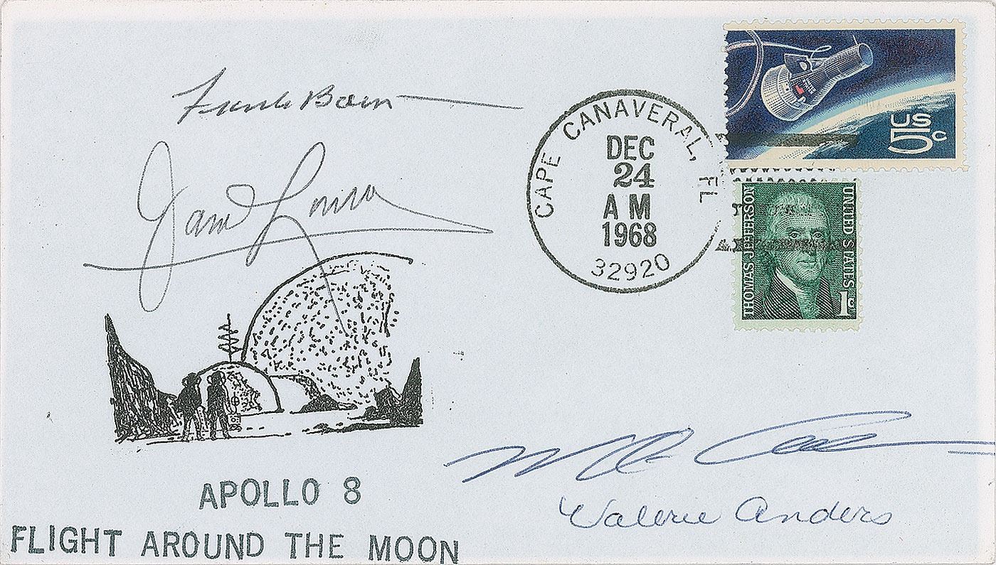 Postal cover with a stamped cachet honoring the Apollo 8 mission and reading, "Flight Around the Moon," postmarked December 24, 1968, signed in black ballpoint, "Frank Borman," "James Lovell," and "W. A. Anders." The cover is also signed by Anders' wife, Valerie. In fine condition. Accompanied by a certificate of authenticity from Astronaut Central for the Borman signature.