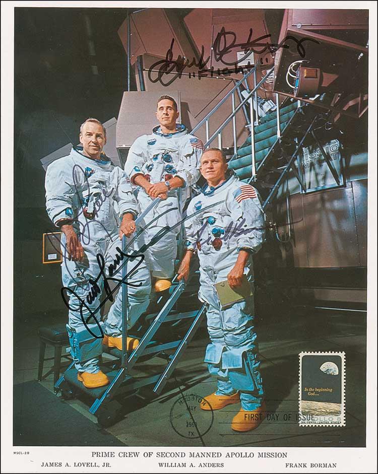 Color 8 x 10 NASA photo of the Apollo 8 crew with an affixed commemorative stamp and first-day cancellation at lower right. Signed in black felt tip by James Lovell, William Anders (last name only), Frank Borman, and former NASA Flight Director Eugene Kranz, adding “Flight.” The photo also bears an additional autopen signature from Lovell. In fine condition, with Lovell signing over the beginning portion of Ander’s signature and show-through from first-day cancellation to reverse. Pre-certified Scott Cornish and RRAuction COA.