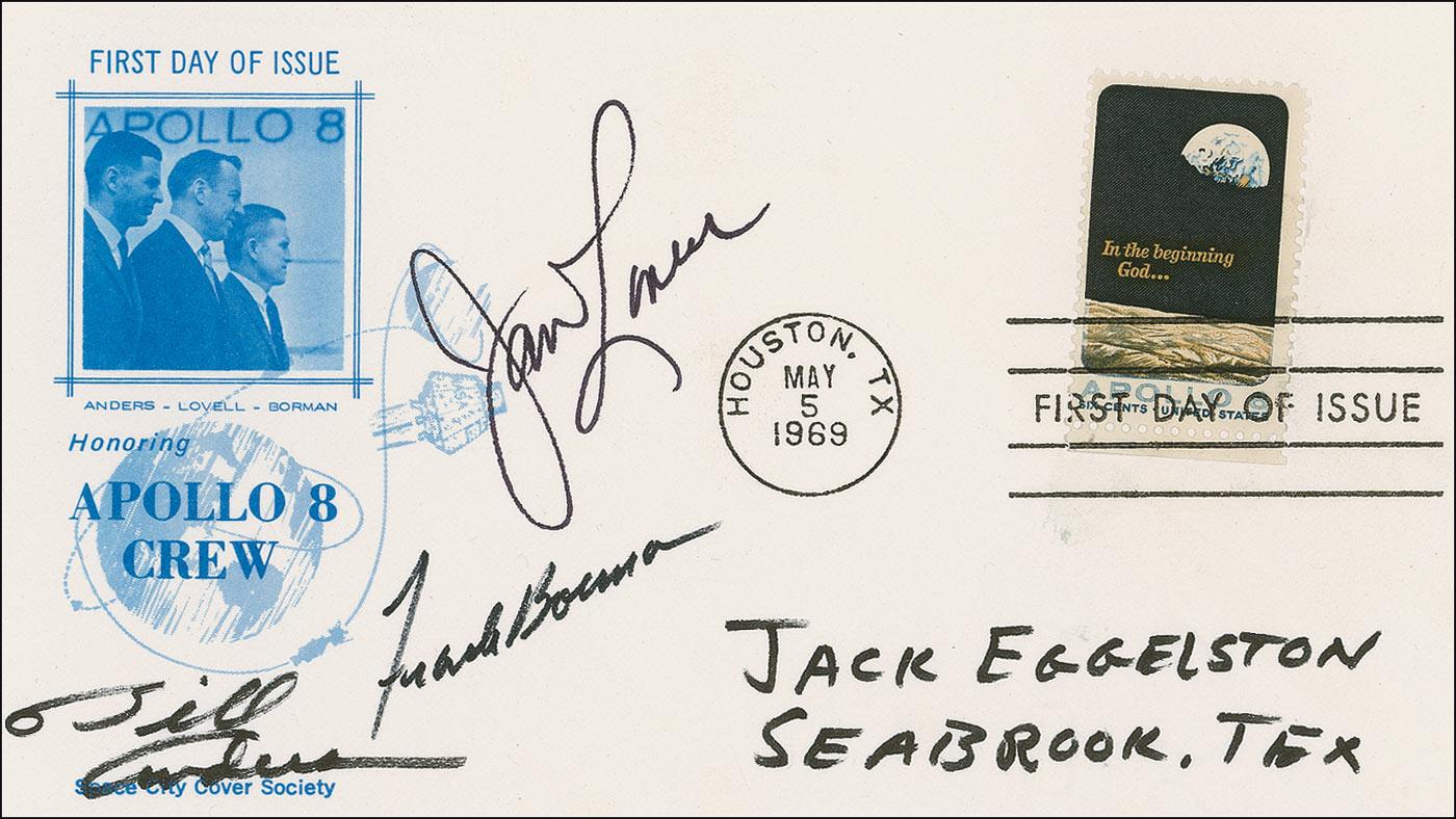 FDC with a cachet honoring the Apollo 8 crew, signed on the front in black felt tip by James Lovell, Bill Anders, and Frank Borman. In fine condition, with a small address in another hand to lower right. Anders is very scarce in any form!