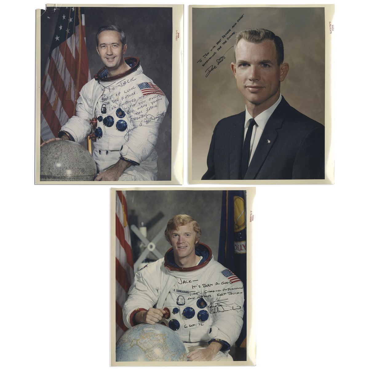 Lot of three Apollo 9 astronaut photos signed and dedicated to Jack Swigert from his personal collection. James McDivitt's portrait is inscribed in his hand, ''To Jack / Best of luck in the future. I've enjoyed working with you over our many years in the space program. James A McDivitt''. Rusty Schweickart pens, ''Jack - It's been a good time - Sharing experiences and names. Keep truckin'. Rusty Schweickart / 6 Sept 72''. Dave Scott writes, ''To Jack with best regards and great expectations for the future. Dave Scott''. Scott's photo features the NASA publicity blurb on verso. Each color glossy photo measures 8'' x 10''. Buckling. In good to very good condition. With an LOA from the Jack Swigert estate.