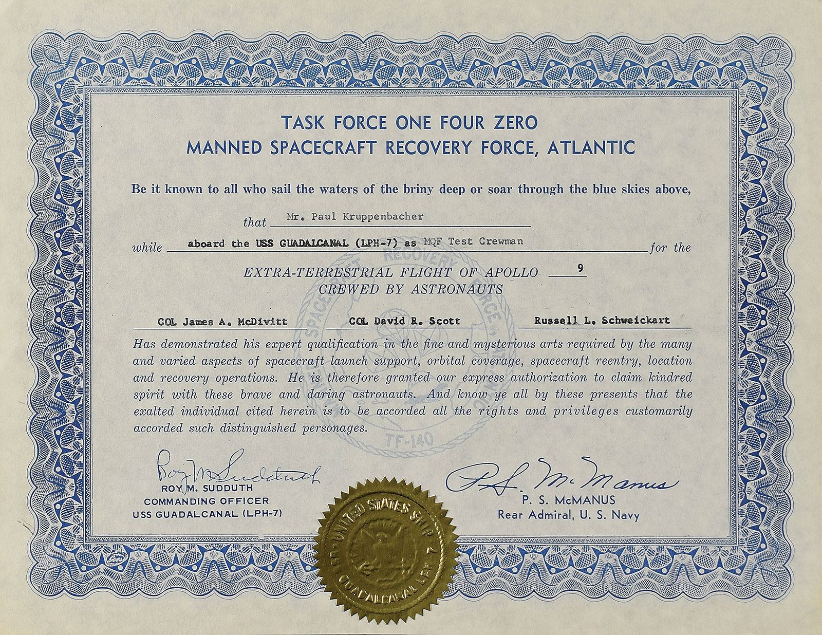 Scarce certificate of commendation from Task Force One Four Zero (TF-140), the Manned Spacecraft Recovery Force of the Atlantic Ocean, one page, 11 x 8.5, no date but circa March 1969, which reads, in full: "Be it known to all who sail the waters of the briny deep or soar through the blue skies above, that Mr. Paul Kruppenbacher while aboard the USS Guadalcanal (LPH-7) as MQF test Crewman for the Extra-Terrestrial Flight of Apollo 9 crewed by astronauts Col. James A. McDivitt, Col. David R. Scott, and Russell L. Schweickart, has demonstrated his expert qualification in the fine and mysterious arts required by the many and varied aspects of spacecraft launch support, orbital coverage, spacecraft reentry, location and recovery operations. He is therefore granted our express authorization to claim kindred spirit with these brave and daring astronauts. And know ye all by these presents that the exalted individual cited herein is to be accorded all the rights and privileges customarily accorded such distinguished personages." Lower portion bears two facsimile signatures and the original gold foil seal of the USS Guadalcanal. In fine condition. From the personal collection of Paul Kruppenbacher, a member of the NASA Houston Landing and Recovery Division who trained Apollo astronauts in water recovery procedures and was deployed on U.S. Navy aircraft carriers for crew and spacecraft recovery operations.