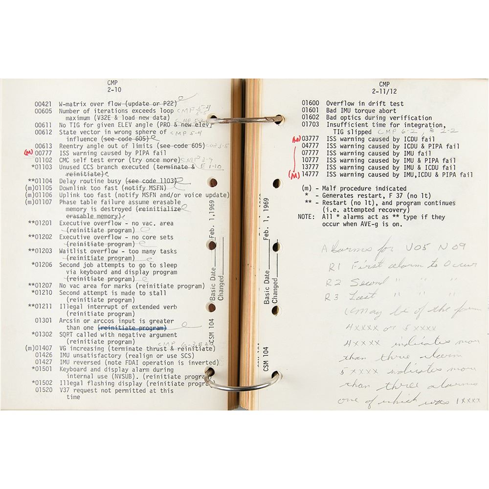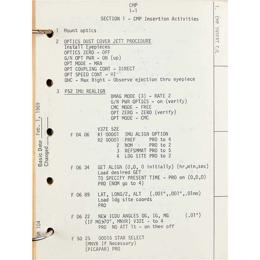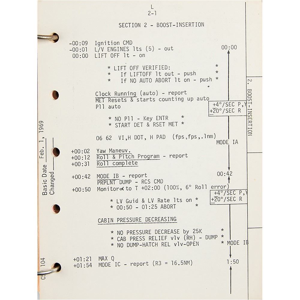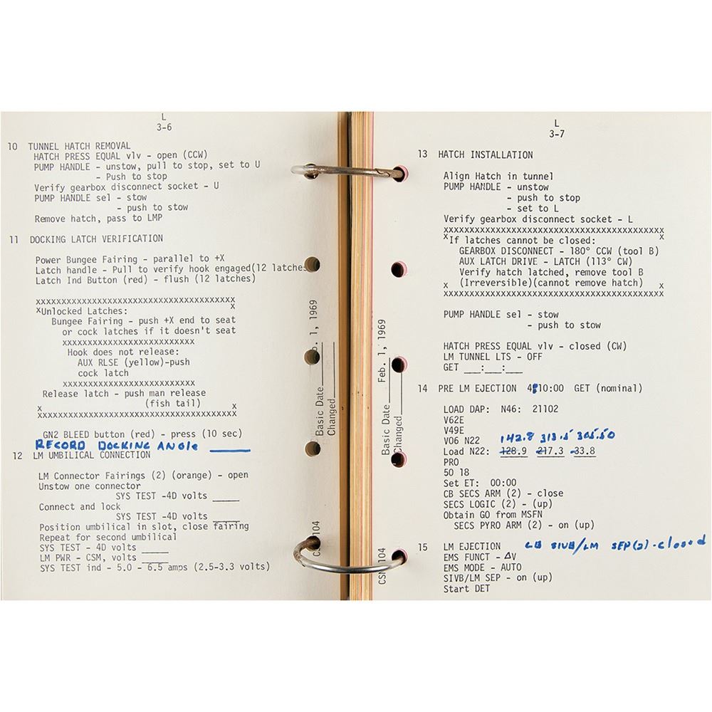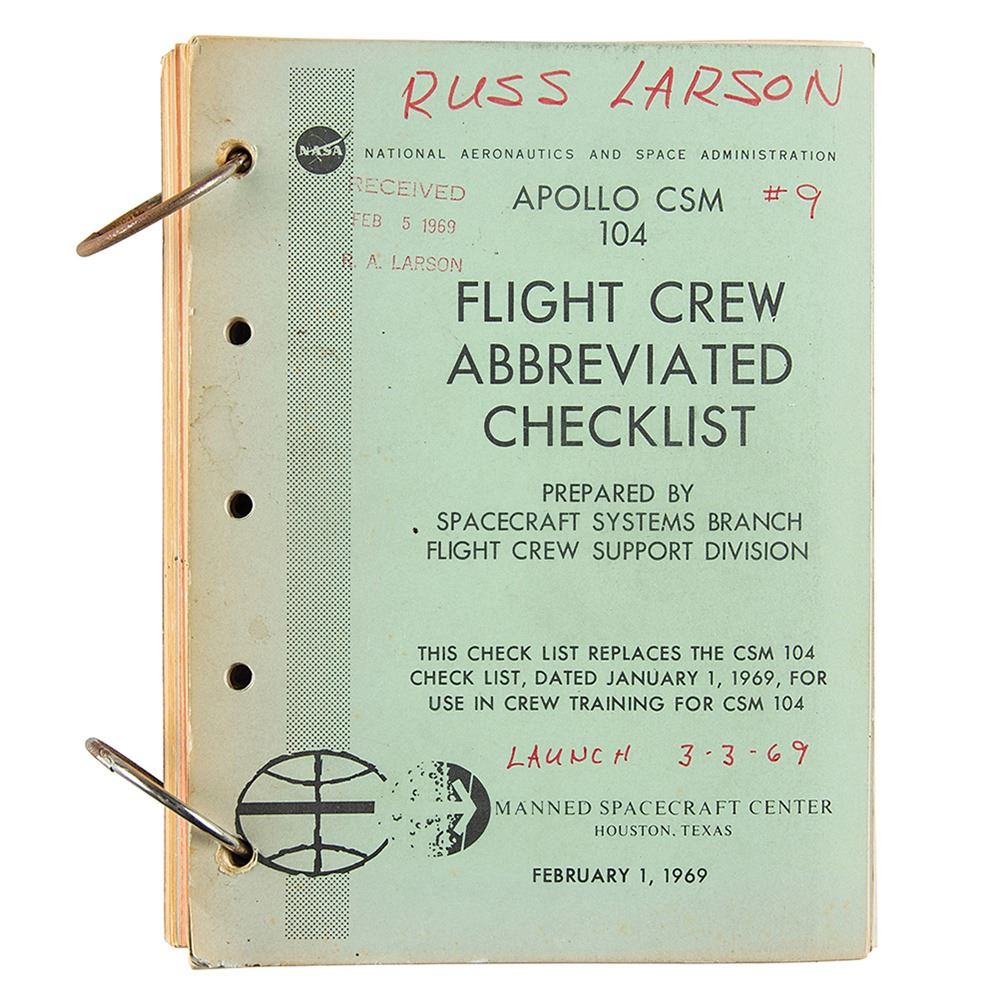 Official ring-bound NASA checklist entitled "Apollo CSM 104, Flight Crew Abbreviated Checklist," used by Russell A. Larson of MIT's Charles Stark Draper Laboratory, prepared by the Manned Spacecraft Center's Spacecraft Systems Branch, 6 x 8, February 1, 1969, stamped as "Received" and marked on the front cover in felt tip, "Russ Larson, #9, Launch 3-3-69." The abbreviated checklist is divided into sections for "Launch Operations," "CMP Checklist," "LMP Checklist," and "Entry Operations." The checklist has copious contemporary pencil and felt tip annotations throughout. In very good to fine condition, with some edge toning and staining to covers, and general wear from use. Russ Larson worked as a program engineer and astronaut liaison at MIT's Instrumentation Lab, where he was involved in programming the Lunar Module's Apollo Guidance Computer; he worked directly with the astronaut crews, training them on the simulators and guidance system.