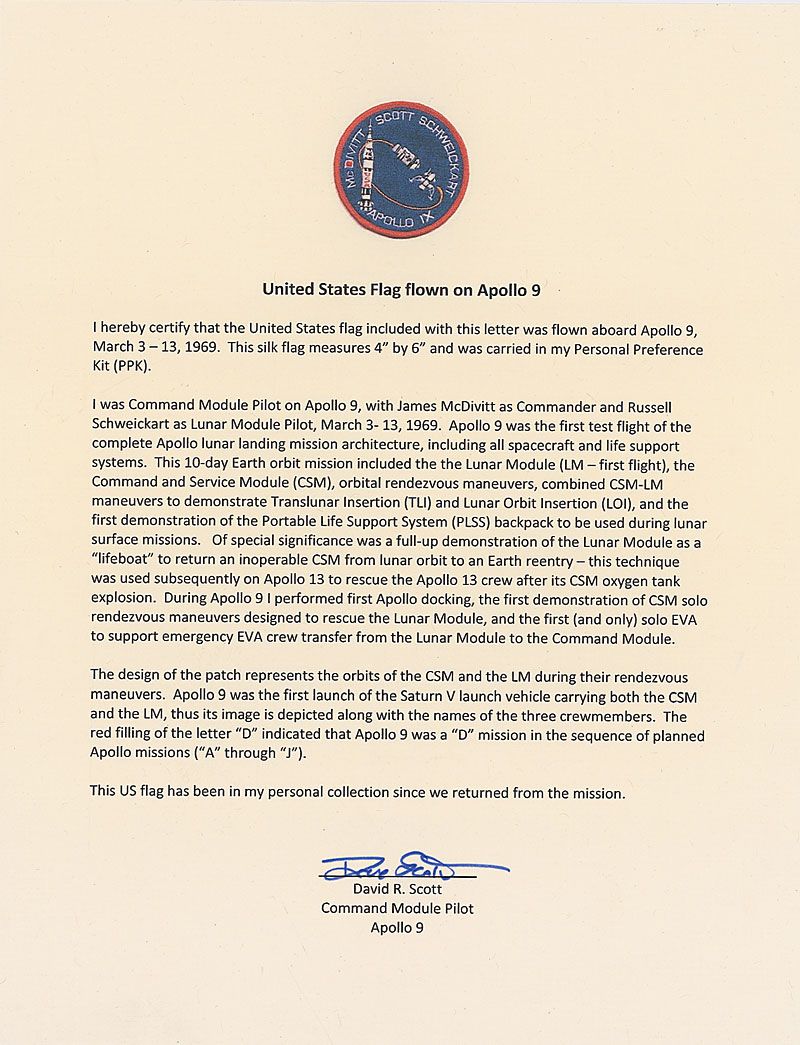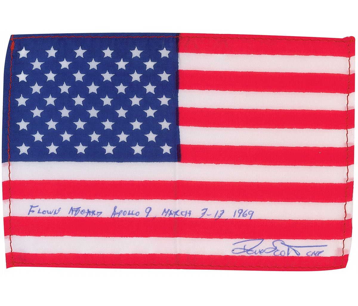 Flown printed fabric American flag, 6 x 4, flown on board Apollo 9, signed on a white stripe in blue ballpoint, “Flown aboard Apollo 9, March 3-13, 1969, Dave Scott, CDR.” Accompanied by a letter of authenticity from Dave Scott stating, in part, “I hereby certify that the United States flag included with this letter was flown aboard Apollo 9, March 3-13, 1969…and was carried in my Personal Preference Kit (PPK)…This US flag has been in my personal collection since we returned from the mission.” In fine condition.