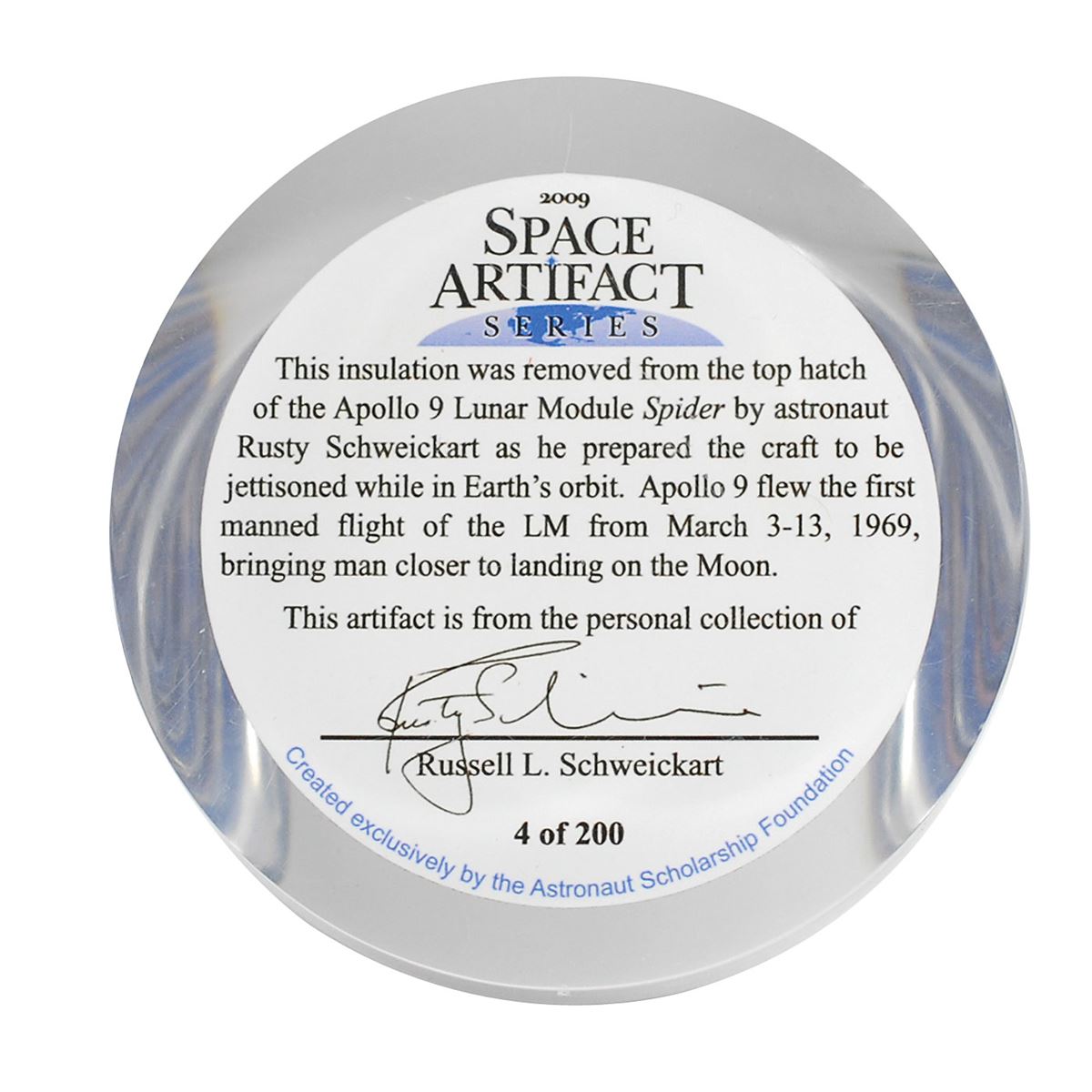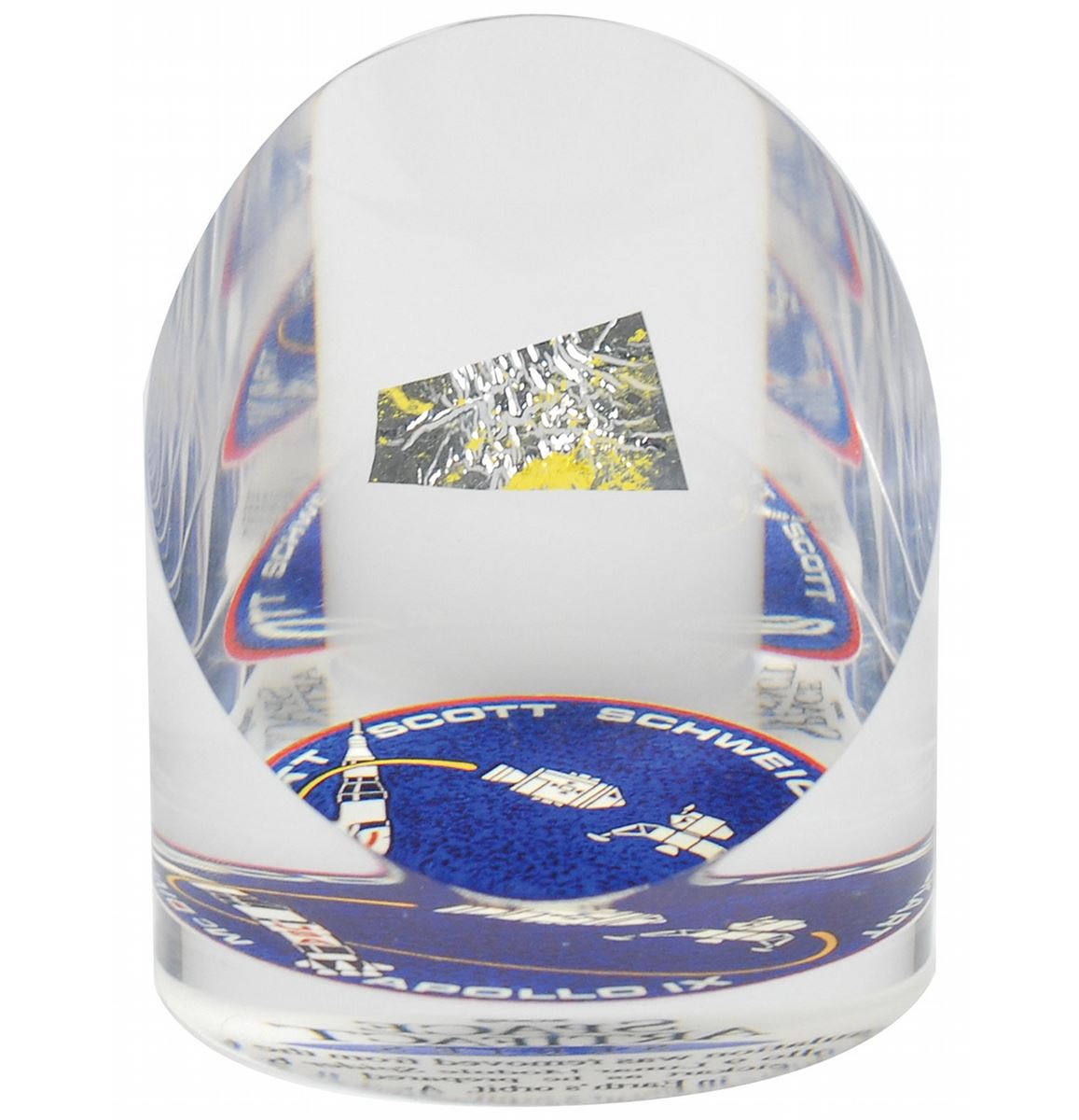 Flown Kapton foil insulation swatch, approximately 1 x .75, removed from the top hatch of the Apollo 9 Lunar Module Spider by Schweickart and McDivitt before the Spider was cast off into space. Encased in a limited edition cylindrical 2.75 x 3.25 piece of Lucite cut at an angle for display purposes, numbered 4/200, with an Apollo 9 emblem and certificate of authenticity at the bottom. In fine condition. Originally distributed through the Astronaut Scholarship Foundation and accompanied by a matching certificate of authenticity signed by Rusty Schweickart, certifying that the swatch is a piece from his personal collection. The Leon Ford Collection.