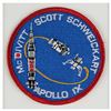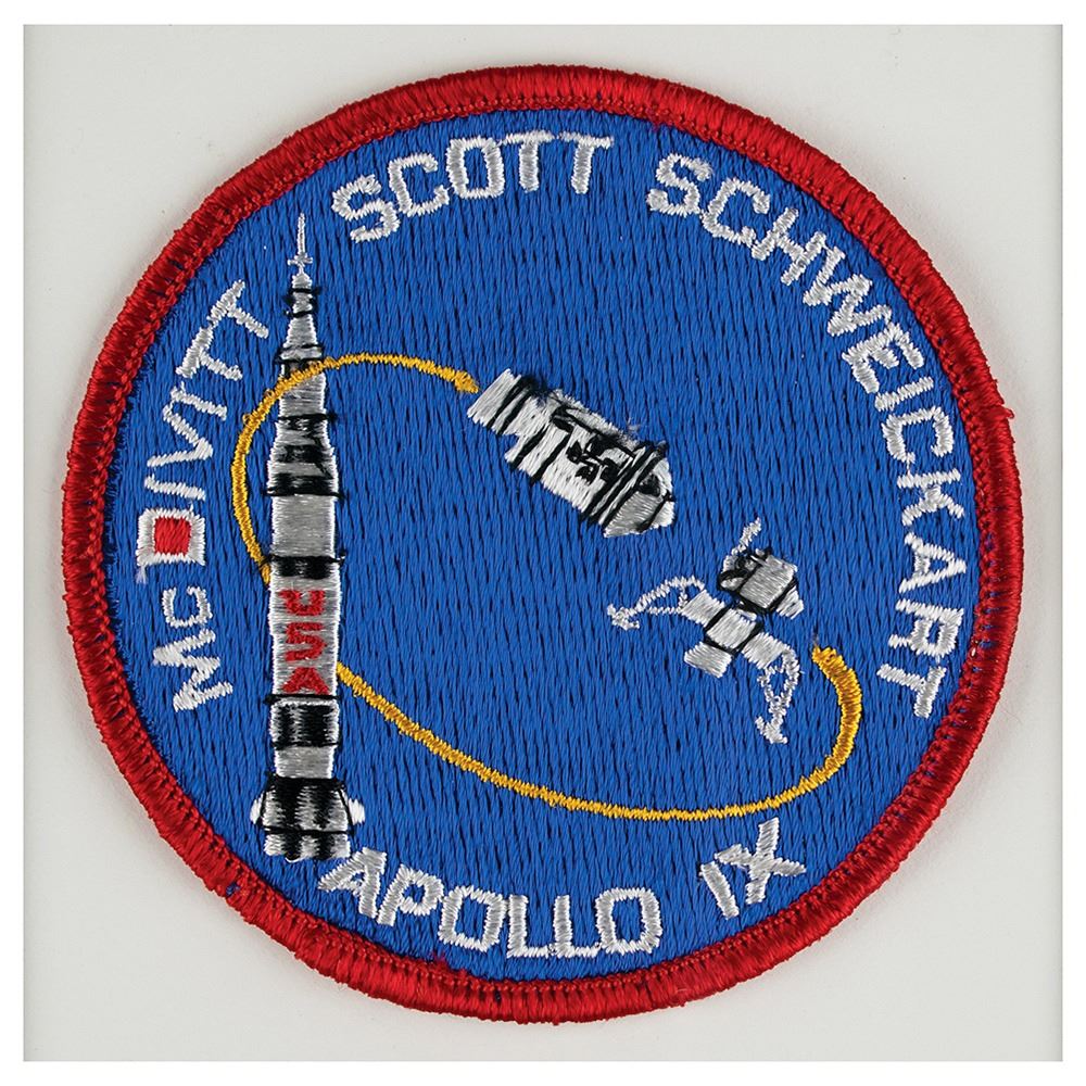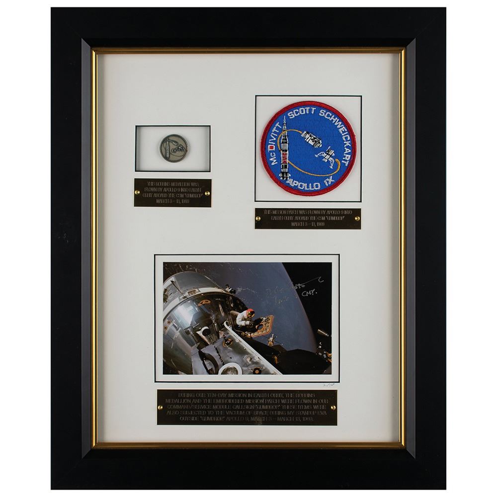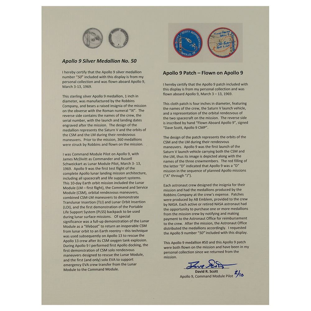 Limited edition display featuring a flown sterling silver Apollo 9 Robbins medallion (No. 50), and a flown embroidered Apollo 9 mission patch, both of which were carried into Earth's orbit during the Apollo 9 mission and derived from the personal collection of astronaut Dave Scott. Both items are mounted and matted with plaques certifying their flown status, and a color photo of Scott performing a stand-up EVA on March 6, 1969, signed in silver ink, "Dave Scott, Apollo 9 CMP"; the entire display, numbered 2/10, is archivally framed to an overall size of 14 x 17. In overall fine condition.