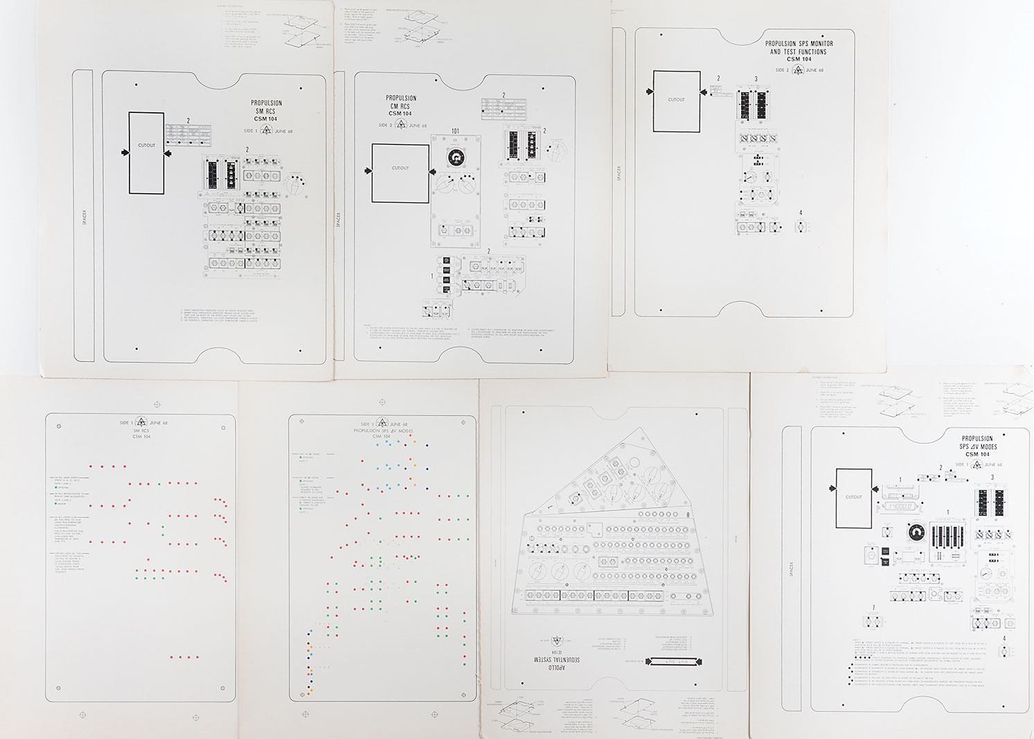 Uncommon set of seven training cards for the Apollo CSM 104, the command service module for the Apollo 9 mission, each approximately 11 x 14.25, published by Apollo Logistics Training in June 1968. The cards feature control panel modes and diagrams related to the Service Propulsion System, the Reaction Control System, Monitor and Test Functions, and the Apollo Sequential System. In overall fine condition.
