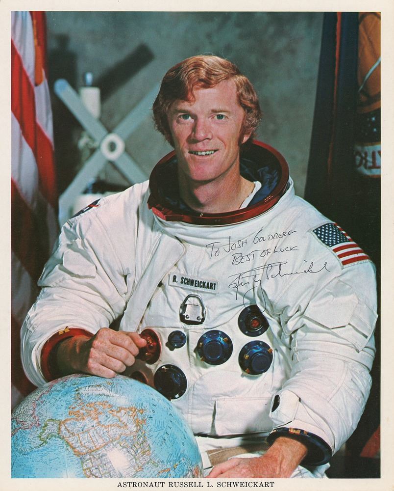 Two official color 8 x 10 NASA lithographs of the Apollo 9 crewmen in their white space suits, one signed in green felt tip, "James A. McDivitt," and the other signed and inscribed in black ballpoint, "To Josh Goldberg, Best of Luck, Rusty Schweickart." In fine condition.