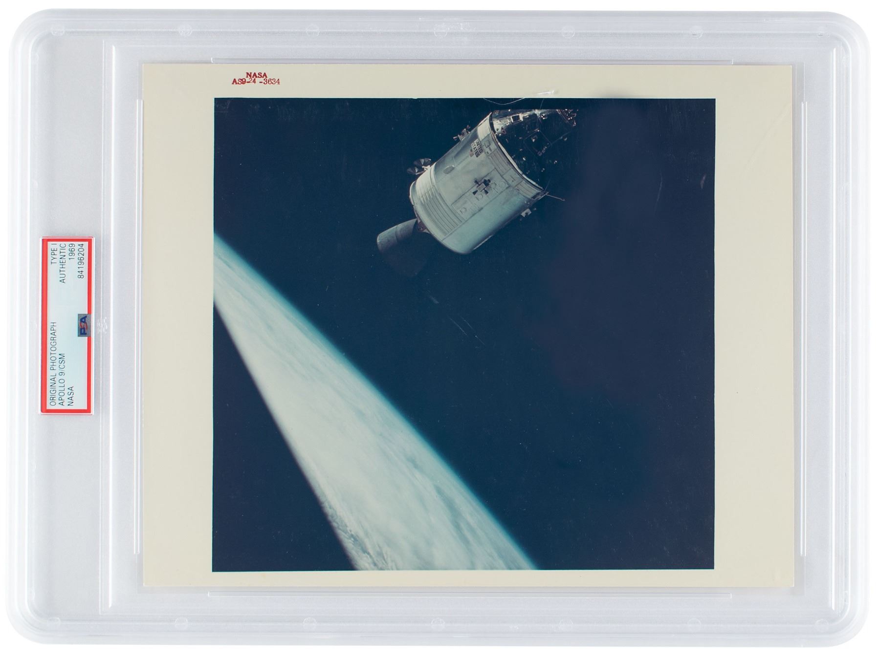 Official 'Type 1' first generation color glossy 10 x 8 red-numbered NASA photo of the Apollo 9 Command Module ‘Gumdrop’ as viewed from the Lunar Module ‘Spider’ on the fifth day of the earth-orbital mission. Inside the LM were Commander Jim McDivitt and LMP Rusty Schweickart, while Command Module Pilot Dave Scott remained at the controls of the ‘Gumdrop.’ The photo, identified as "AS9–24–3634," features purple NASA caption text and "A Kodak Paper" watermarks to reverse. In fine condition. Encapsulated in a PSA/DNA authentication holder.
