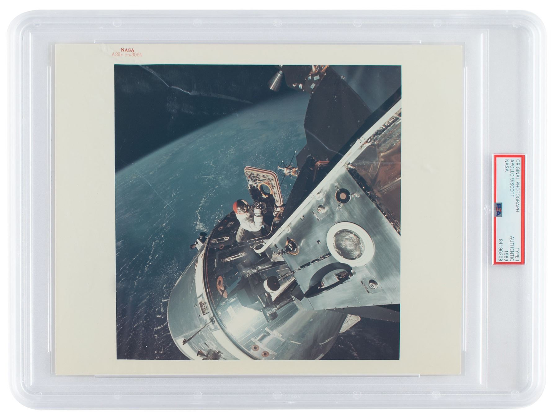 Official 'Type 1' first generation color glossy 10 x 8 red-numbered NASA photo of the docked Apollo 9 Command Module ‘Gumdrop’ and Lunar Module ‘Spider,’ with Earth in the background, during CMP Dave Scott's stand-up extravehicular activity on the fourth day of the earth-orbital mission. LMP Rusty Schweickart took this photograph from the porch of the Lunar Module. The photo, identified as "AS9–20–3064," features "A Kodak Paper" watermarks to reverse. In fine condition. Encapsulated in a PSA/DNA authentication holder.