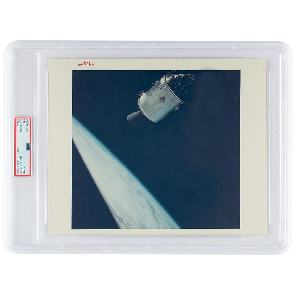 Official 'Type 1' first generation color glossy 10 x 8 red-numbered NASA photo of the Apollo 9 Command Module ‘Gumdrop’ as viewed from the Lunar Module ‘Spider’ on the fifth day of the earth-orbital mission. Inside the LM were Commander Jim McDivitt and LMP Rusty Schweickart, while Command Module Pilot Dave Scott remained at the controls of the ‘Gumdrop.’ The photo, identified as "AS9–24–3634," features purple NASA caption text and "A Kodak Paper" watermarks to reverse. In fine condition. Encapsulated in a PSA/DNA authentication holder.