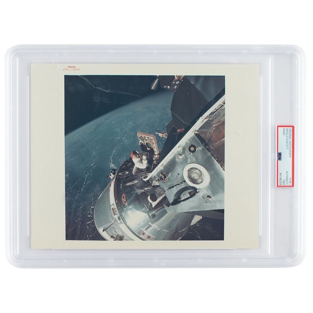 Official 'Type 1' first generation color glossy 10 x 8 red-numbered NASA photo of the docked Apollo 9 Command Module ‘Gumdrop’ and Lunar Module ‘Spider,’ with Earth in the background, during CMP Dave Scott's stand-up extravehicular activity on the fourth day of the earth-orbital mission. LMP Rusty Schweickart took this photograph from the porch of the Lunar Module. The photo, identified as "AS9–20–3064," features "A Kodak Paper" watermarks to reverse. In fine condition. Encapsulated in a PSA/DNA authentication holder.