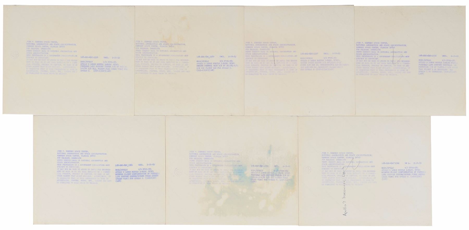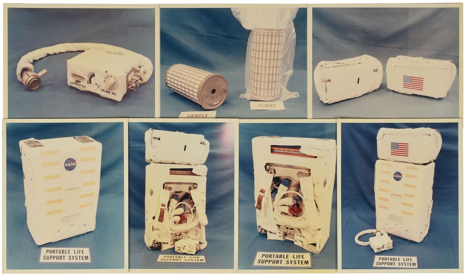 Set of seven original vintage color glossy NASA photos, 8 x 10 and 10 x 8, showing various essential equipment for the crew of Apollo 9, with images including: four different views of the Portable Life Support System (PLSS), two of which show the mounted oxygen purge system; an image of the oxygen purge systems for LMP Rusty Schweickart and CDR Jim McDivitt; a sample and flight cartridge for the PLSS; and a close-up of the remote control unit for the PLSS. Reverse of each photo bears official purple NASA caption text and “A Kodak Paper” watermarks. In overall fine condition.