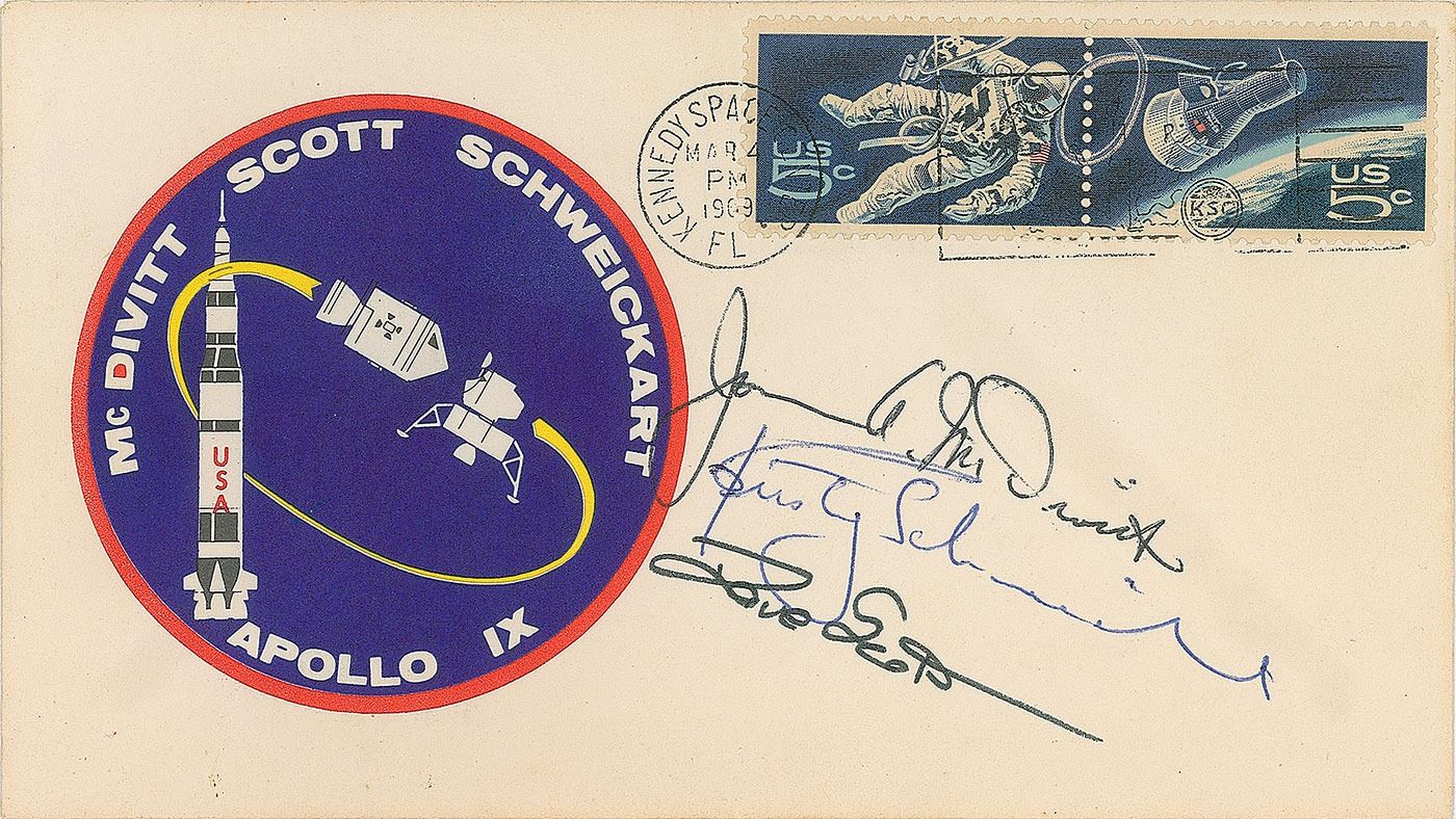 Commemorative cover with a color cachet of the Apollo 9 mission insignia, postmarked at KSC on the second day of the mission, signed in felt tip and ballpoint by James McDivitt, Rusty Schweickart, and Dave Scott. In fine condition. Consignor notes that this was signed at an Apollo VIP launch site during the early 1970s; crew-emblem signed covers are seldom seen. From the collection of aerospace memorabilia specialist Ken Havekotte.