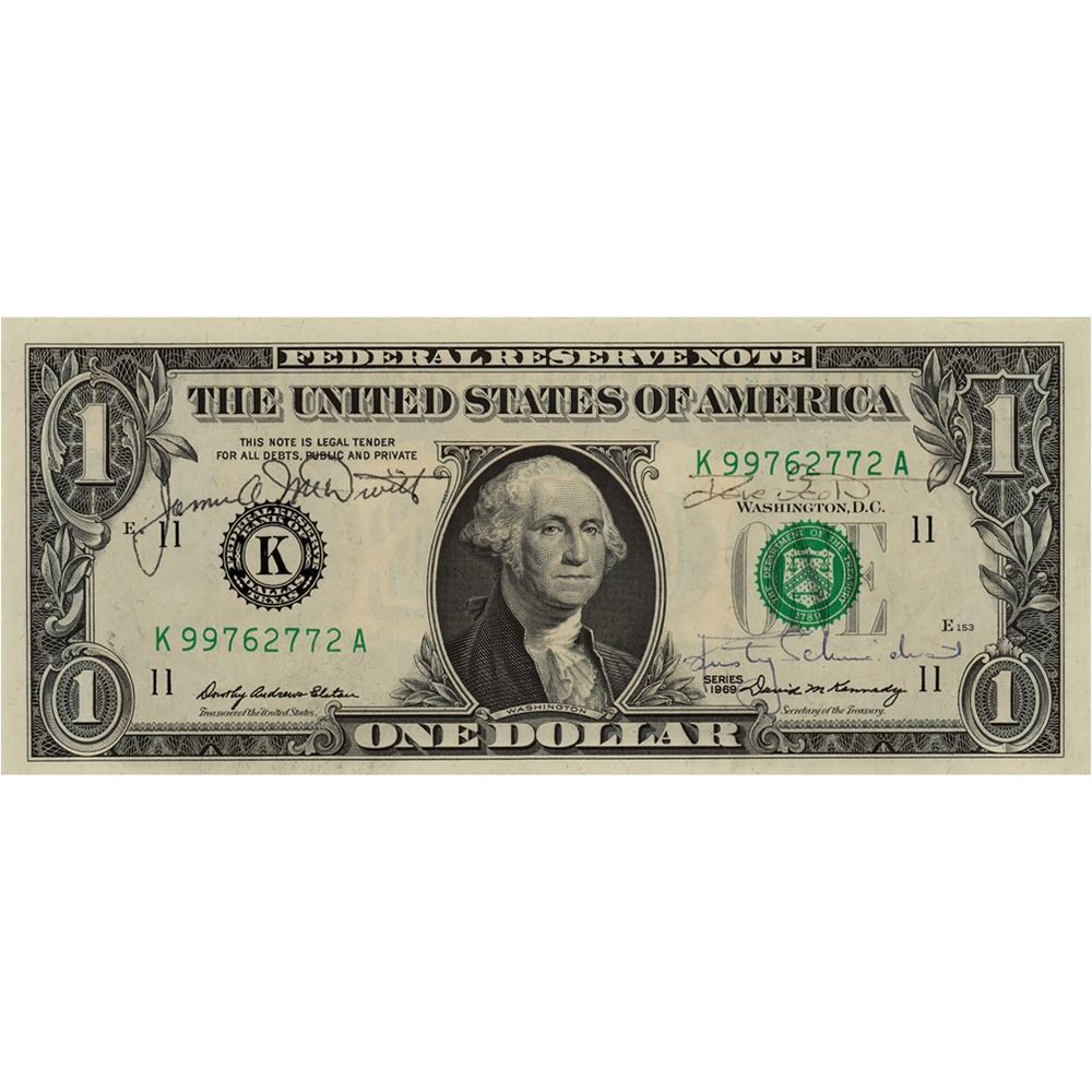 Crisp Series 1969 one-dollar bill, signed in black ballpoint by the Apollo 9 crew: Dave Scott, Rusty Schweickart, and Jim McDivitt. In very fine condition. A desirable example of this uncommon format.