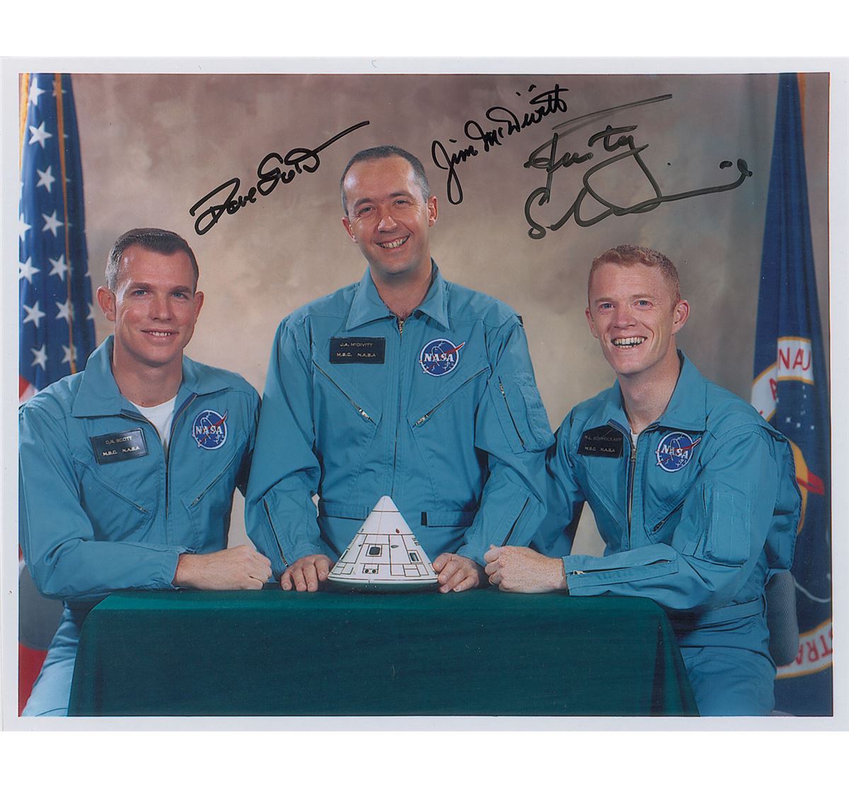 Color glossy 10 x 8 photo of the Apollo 9 crew in their blue flight suits, each signing in black felt tip, “Dave Scott,” “Jim McDivitt,” and “Rusty Schweickart.” In fine condition.