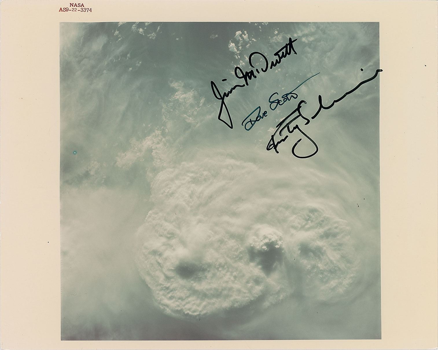 Official color glossy 10 x 8 red-numbered NASA photo of a mass of storm clouds hovering above Earth, signed in black felt tip by Jim McDivitt, Dave Scott, and Rusty Schweickart. Reverse bears "A Kodak Paper" watermarks. In fine condition.
