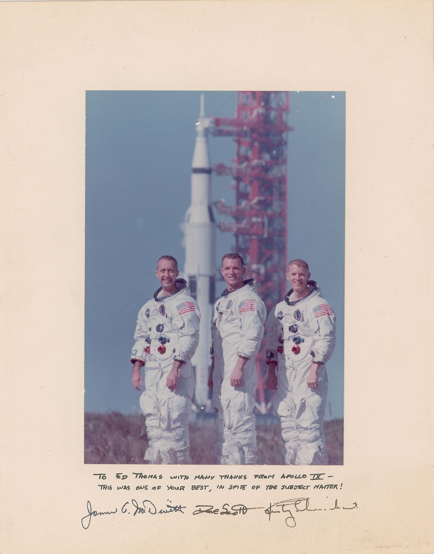Official color glossy 6.5 x 9.5 NASA photo of the Apollo 9 crew posing in their white space suits with the Saturn V launch vehicle looming in the background, affixed to the original 11 x 14 mount, signed and inscribed on the mount in black felt tip, "To Ed Thomas with many thanks from Apollo IX—this was one of your best, in spite of the subject matter! Dave Scott," "James A. McDivitt," and "Rusty Schweickart.” In fine condition, with a few specks of emulsion loss to upper portion, and trivial wear to mount edges.