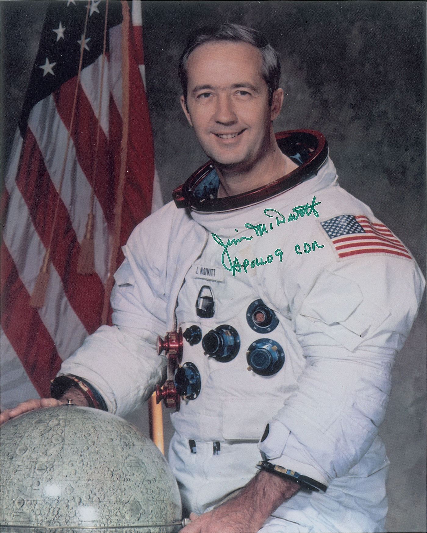 Appealing grouping of three color 8 x 10 photos of the individual members of the Apollo 9 crew: a satin-finish white space suit portrait of McDivitt, signed in green felt tip, "Jim McDivitt, Apollo 9 CDR"; a cardstock photo of Scott during his stand-up EVA, signed in black felt tip, "Dave Scott, Apollo 9"; and a satin-finish white space suit portrait of Schweickart, signed in black felt tip, "Rusty Schweickart, Apollo 9." In overall fine condition, with some light creasing the the Scott photo.