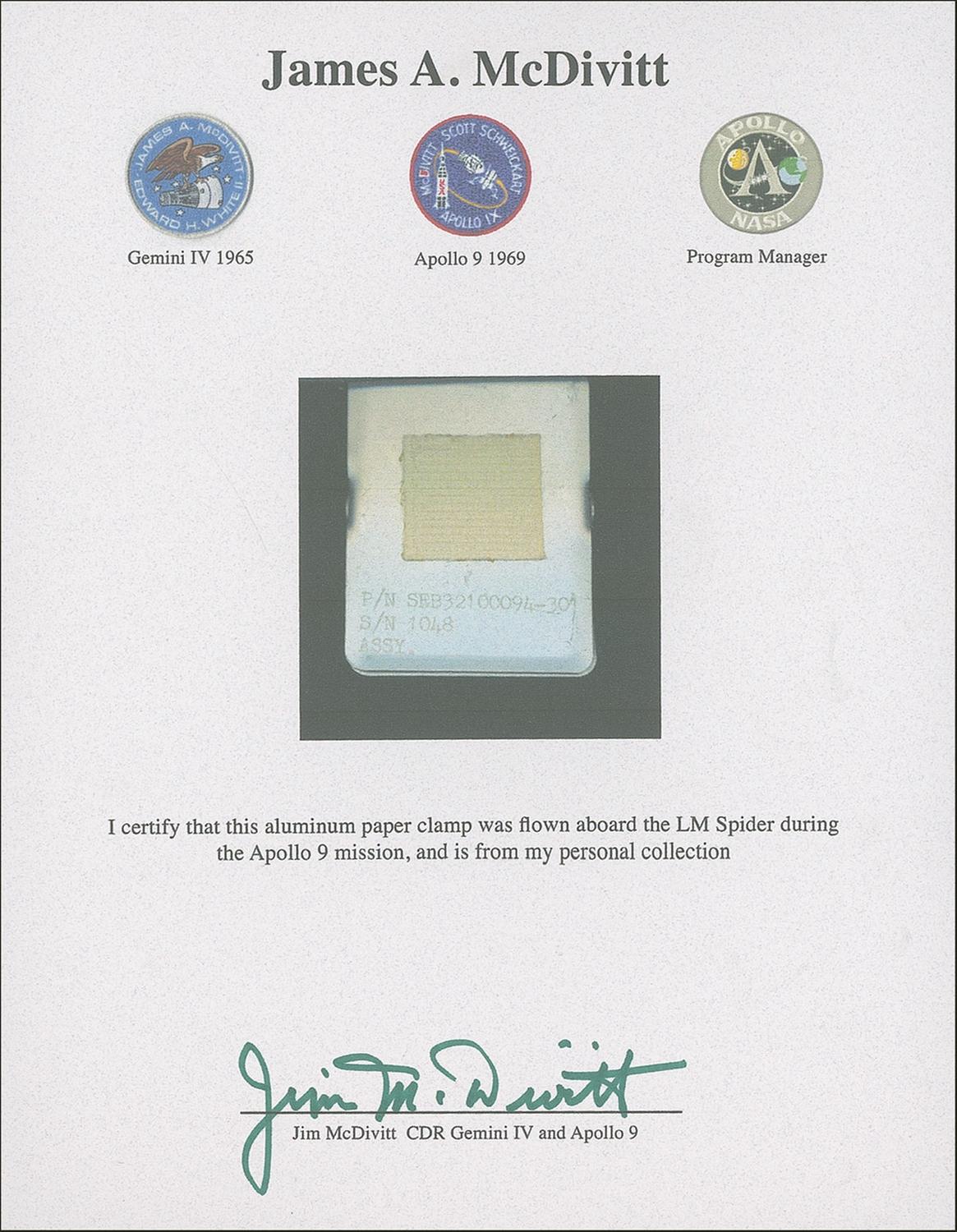 Unique aluminum paper clamp, 2.25 x 2, flown and used on the lunar module in Earth orbit during the 1969 Apollo 9 mission. The clip was used to hold open checklists, flight data files, and other paper items. Numbered “P/N SEB22100094-30, S/N 1048, ASSY,” which conclusively tie the item to the flight manifest. Accompanied by a signed illustrated letter of provenance from James McDivitt that reads, “I certify that this aluminum paper clamp was flown aboard the LM Spider during the Apollo 9 mission, and is from my personal collection.” The Apollo 9 mission is historic as it is the first flight of a lunar module, and the first full shakeout test flight in Earth orbit of all the major Apollo equipment, including the command module, command service module, and lunar module.