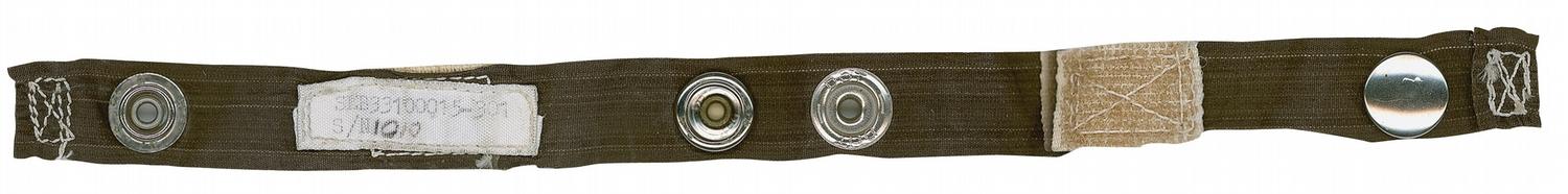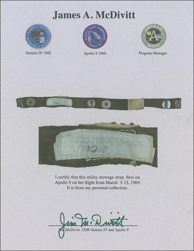 Interesting Earth-orbit flown brown Beta cloth utility strap, 10.5 x .75, used within the Lunar Module ‘Spider’ while in orbit during Apollo 9. The strap has the original SEB and S/N numbers, which can be tied to the flight manifest. Accompanied by a signed illustrated letter of provenance from James McDivitt that reads, “I certify that this utility stowage strap flew on Apollo 9 on her flight from March 3-13, 1969. It is from my personal collection.” Rare mission used artifact as man continued preparations for the moon landing.