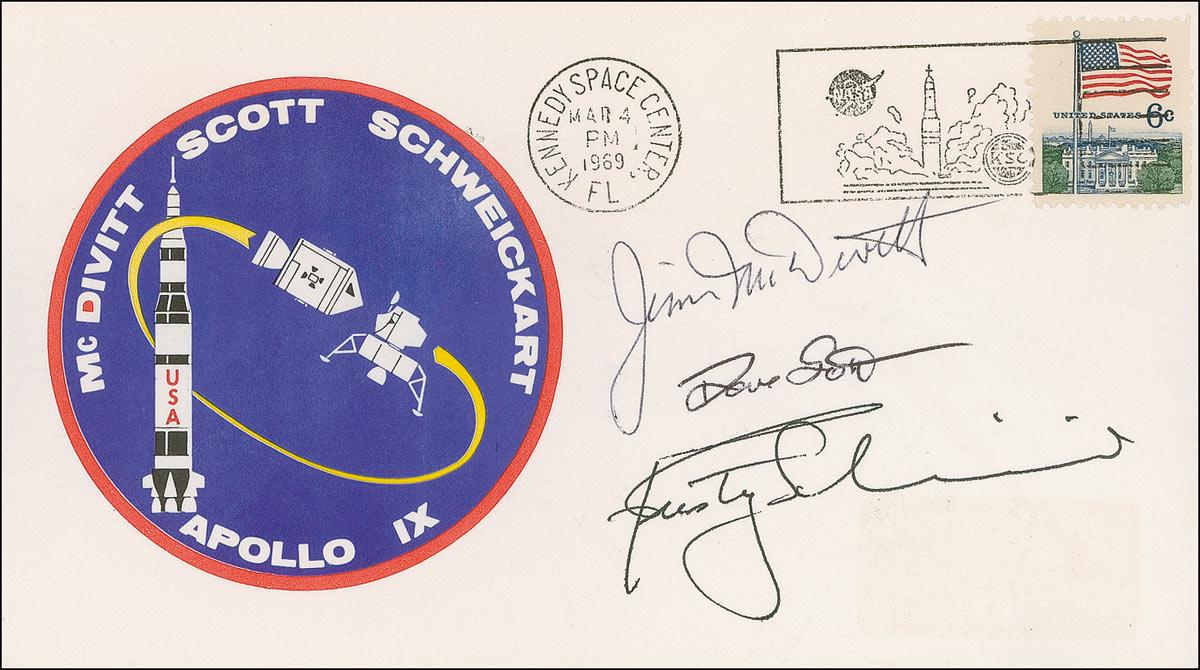 Commemorative cover with a cachet honoring the Apollo 9 mission, signed in black ink by crew members Jim McDivitt, Dave Scott, and Rusty Schweickart. In fine condition, with a small block of toning to lower right from a previous address label.