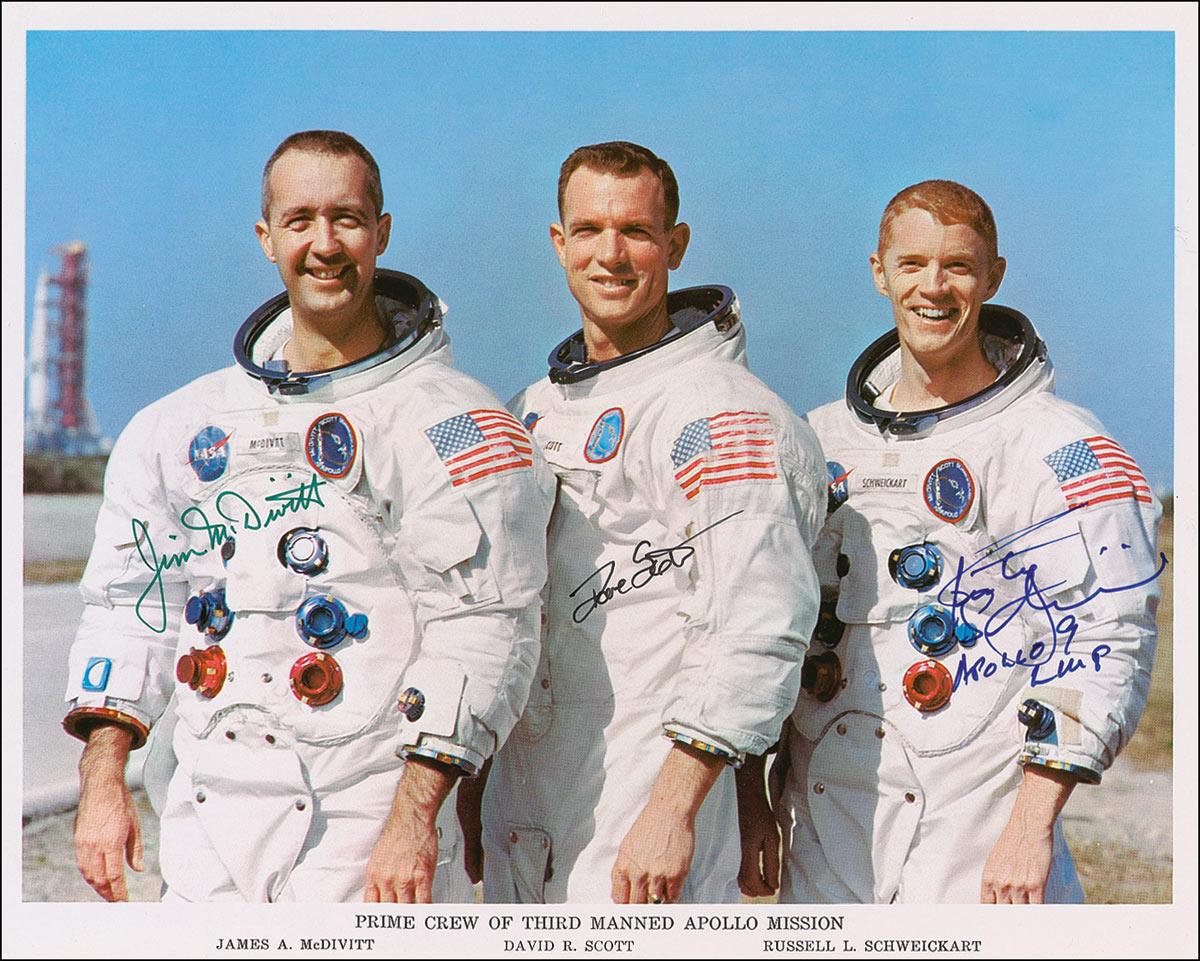 Color 10 x 8 NASA photo of the Apollo 9 crew posing outdoors in their space suits with their rocket on the launch pad in the background, signed in various color felt tip by Jim McDivitt, Dave Scott, and Rusty Schweickart, adding “Apollo 9 LMP.” In very fine condition.