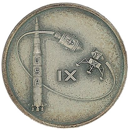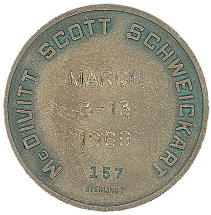 Flown sterling silver Apollo 9 Robbins Medal, approximately 1-inch diameter, with a raised design on the face of the mission insignia. The reverse of the sterling silver medal is engraved with the last names of astronauts James McDivitt, Dave Scott, and Rusty Schweickart, as well as “March 3–13, 1969” and is serial numbered “157.” Normal condition. Accompanied by a 1994 letter of authenticity from Apollo 9 command module pilot Dave Scott, which reads, “This is to certify that the enclosed ‘IX’ silver medallion, Number 157, was carried aboard the Apollo IX spacecraft during the Apollo IX mission from March 3 through March 13, 1969.” Also accompanied by its original presentation case also numbered “157.”
