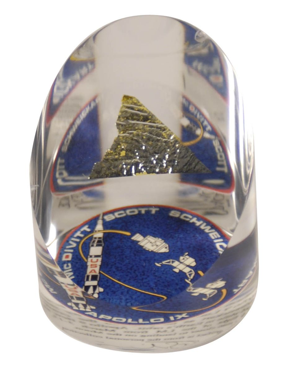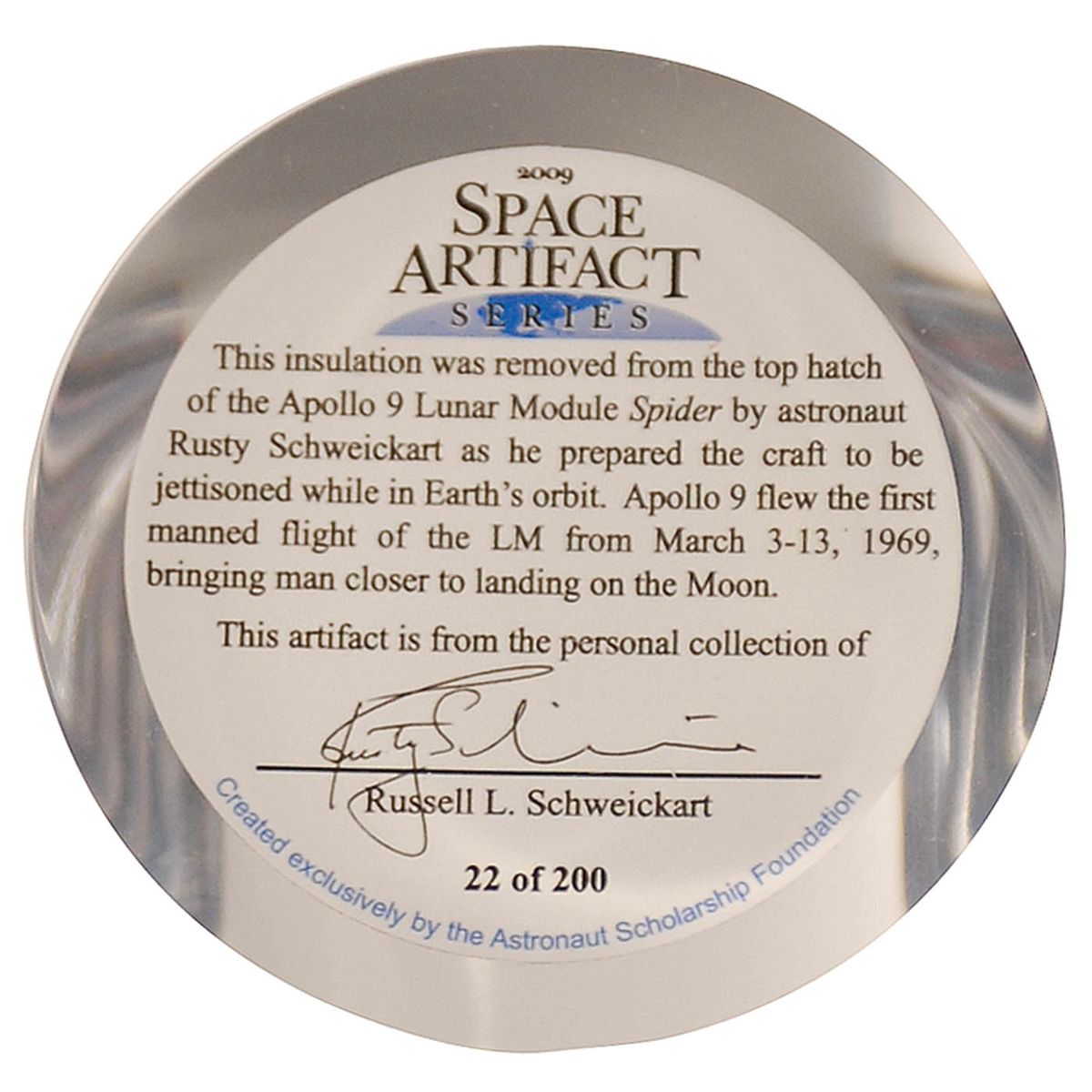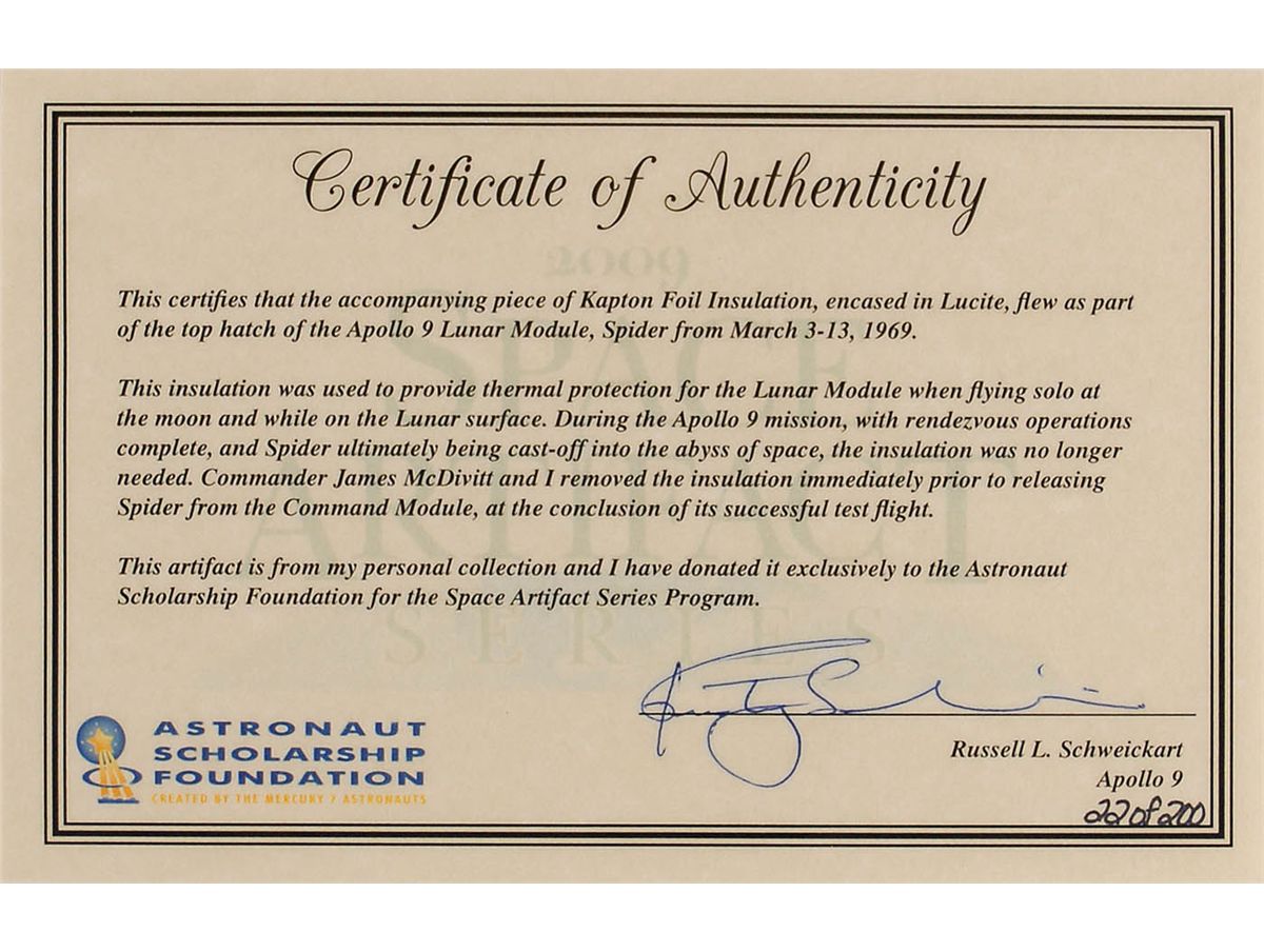 Flown Kapton foil insulation swatch, approximately 1.5 x 1, removed from the top hatch of the Apollo 9 Lunar Module Spider by Schweickart and McDivitt before the Spider was cast off into space. Encased in a cylindrical 2.75 x 3.25 piece of Lucite cut at an angle for display purposes, with an Apollo 9 emblem and certificate of authenticity at the bottom. A limited edition piece, numbered #22/200, originally distributed through the Astronaut Scholarship Foundation. In fine condition, with a couple chips to the Lucite. Accompanied by a matching certificate of authenticity signed by astronaut Russell Schweickart certifying that it is a piece from his personal collection.