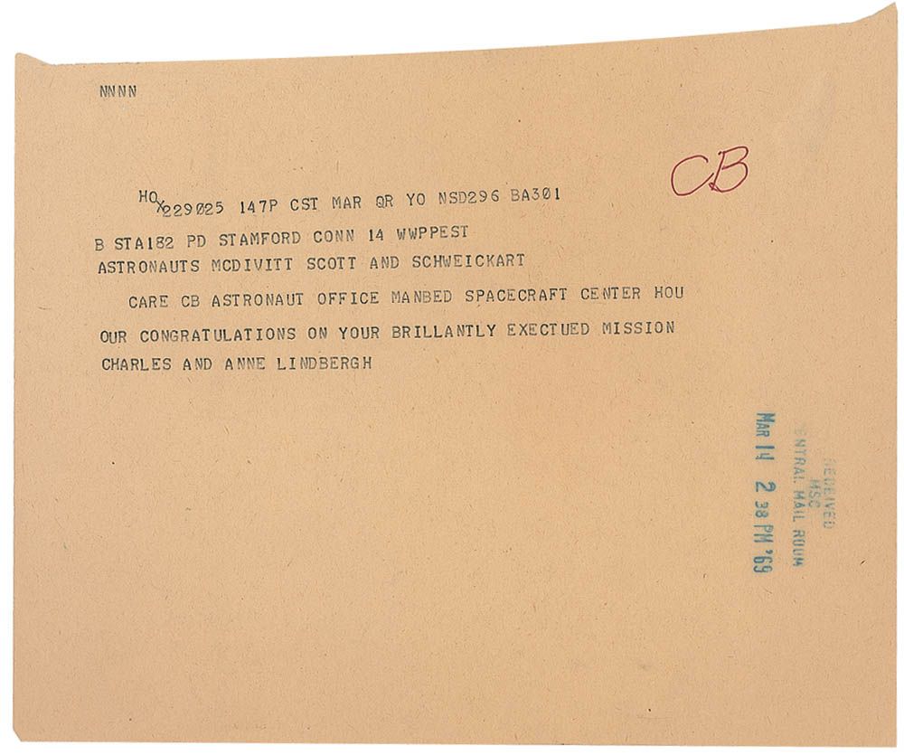 Original printed telegram, one page, 8.25 x 6.5, sent by Charles and Anne Lindbergh to the crew of Apollo 9. Addressed to “Astronauts McDivitt Scott and Schweickart,” telegram reads, in full: “Our congratulations on your brillantly [sic] executed mission. Charles and Anne Lindbergh.” Telegram also bears an MSC mail room stamp, dated March 14, 1969. In fine condition, with a few creases and a rough top edge. Accompanied by a certificate of authenticity from Novaspace as part of Jim McDivitt’s Garage Sale.