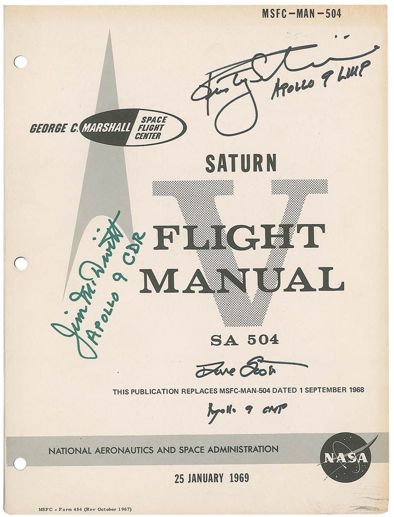 Bound operations manual titled “Saturn V Flight Manual SA 504,” dated January 26, 1969. Manual measures 8.25 x 10.75. An opening page states in part, “This manual was prepared to provide the astronaut with a single source reference as to the characteristics and functions of the SA-504 launch vehicle and AS-504 flight mission.” Manual is full of flow charts, check lists, and procedures for various states as well as emergency detection, performance, instrumentation, and mission variables. Signed on the front cover in black felt tip, “Dave Scott Apollo 9 CMP,” and “Rusty Schweickart, Apollo 9 LMP,” and signed in green felt tip, “Jim McDivitt Apollo 9 CDR.” In fine condition, with some mild toning to front cover. Accompanied by certificates of authenticity from Novaspace for Scott’s and McDivitt’s signatures.