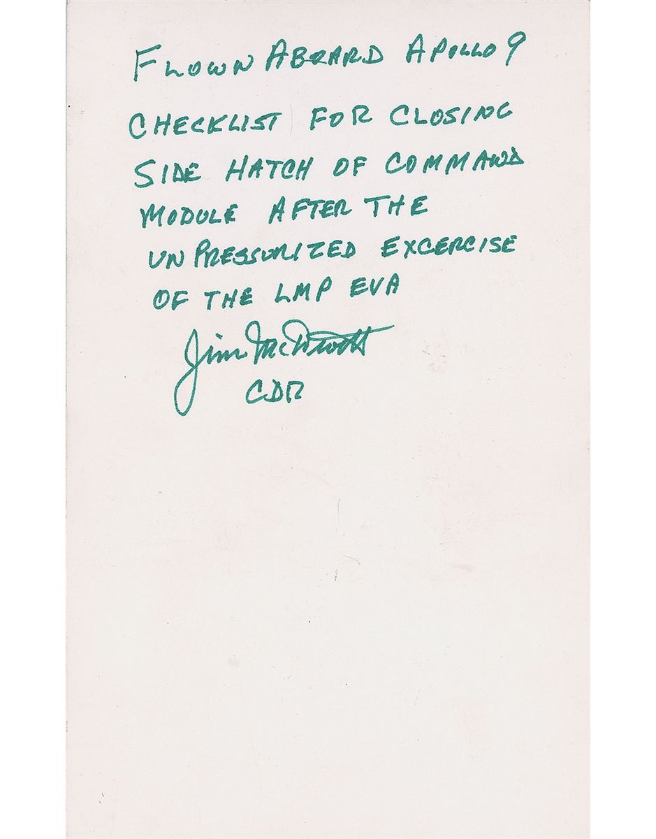 Flown extra-vehicular activity cue card flown on board Apollo 9, 5 x 8, signed on the reverse in green felt tip, “Flown aboard Apollo 9, Checklist for closing side hatch of Command Module after the unpressurized exercise of the LMP EVA, Jim McDivitt, CDR.” Card is single-sided and lists procedures for closing the hatch post-EVA. In fine condition. The Apollo 9 EVA was especially important, as they tested the new Apollo spacesuit, which was the first to have its own, detached life support system.