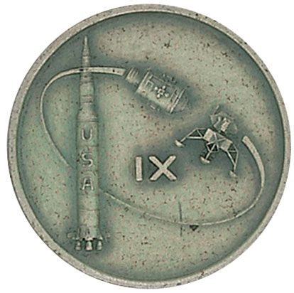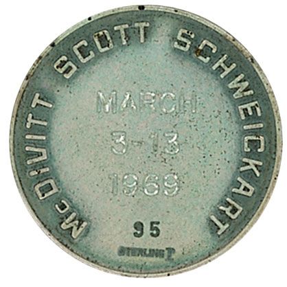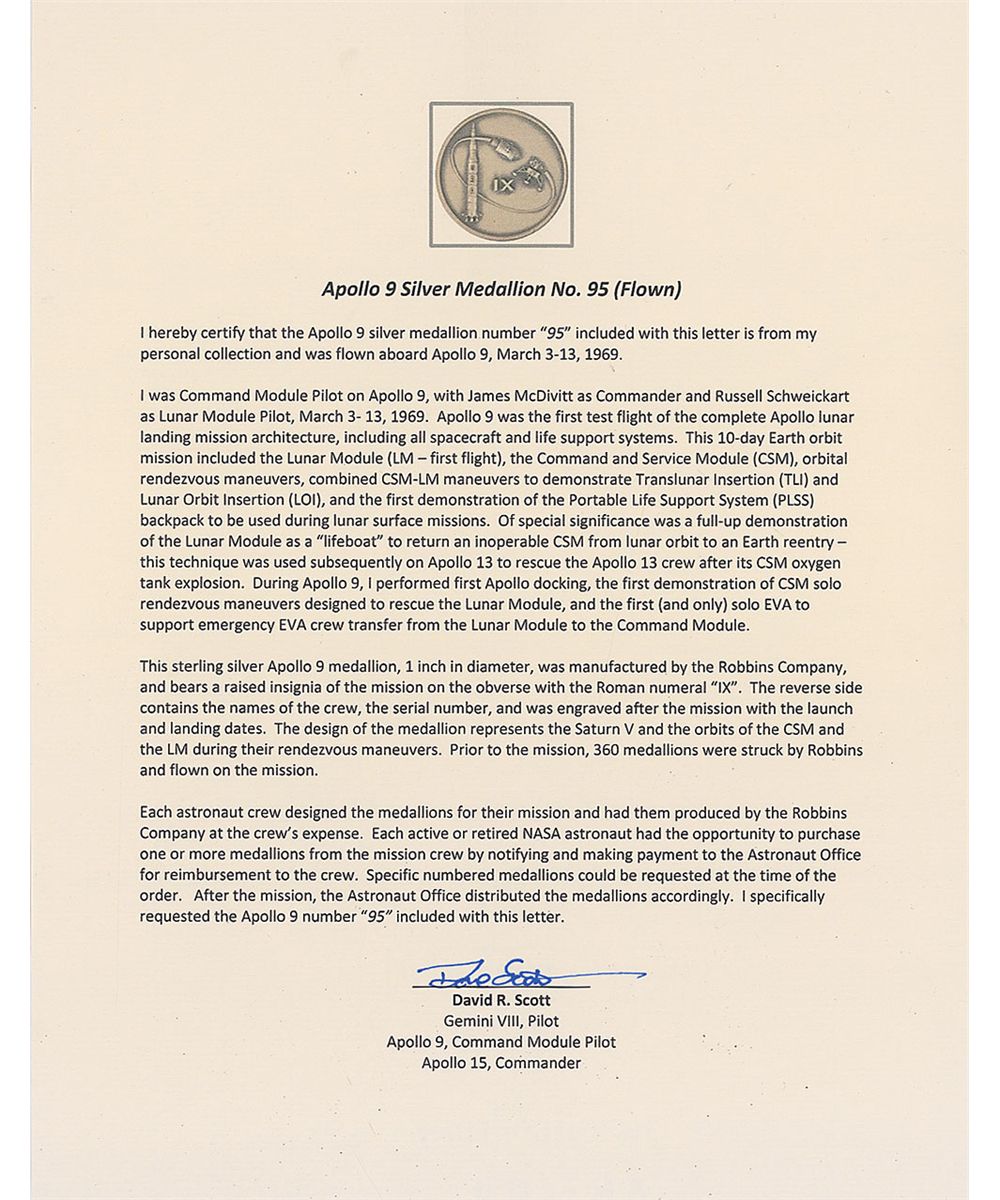 Flown Apollo 9 Robbins Medal, approximately 1-inch diameter, with a raised design on the face of the mission insignia. The reverse of the sterling silver medal is engraved with the last names of astronauts James McDivitt, Dave Scott, and Rusty Schweickart, as well as “March 3–13, 1969” and is serial numbered “95.” Normal condition. Accompanied by a letter of authenticity signed by Dave Scott, which reads, in part: “I hereby certify that the Apollo 9 silver medallion number ‘95’ included with this letter is from my personal collection and was flown aboard Apollo 9, March 3–13, 1969…After the mission, the Astronaut Office distributed the medallions accordingly. I specifically requested the Apollo 9 number ‘95’ included with this letter.”
