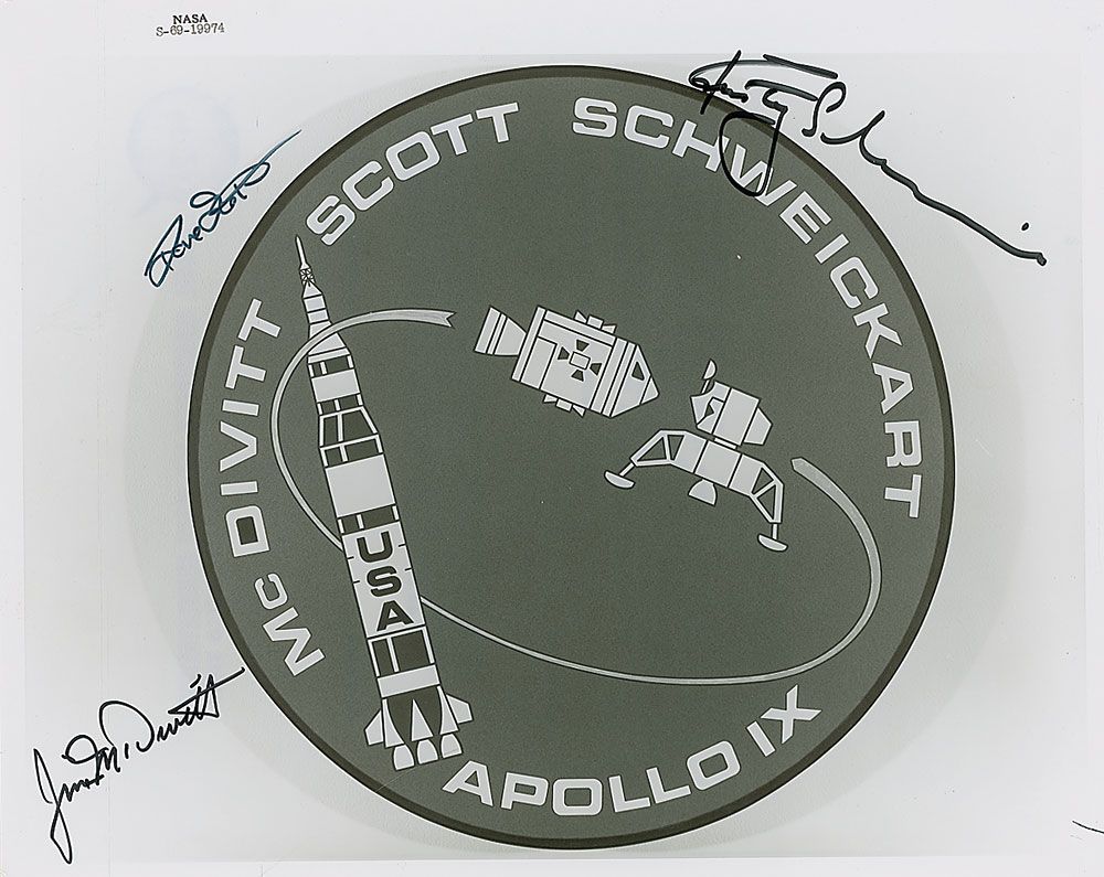 Glossy 10 x 8 NASA photo of the Apollo 9 mission emblem, signed in black felt tip by Dave Scott, Jim McDivitt, and Rusty Schweickart. In fine condition.