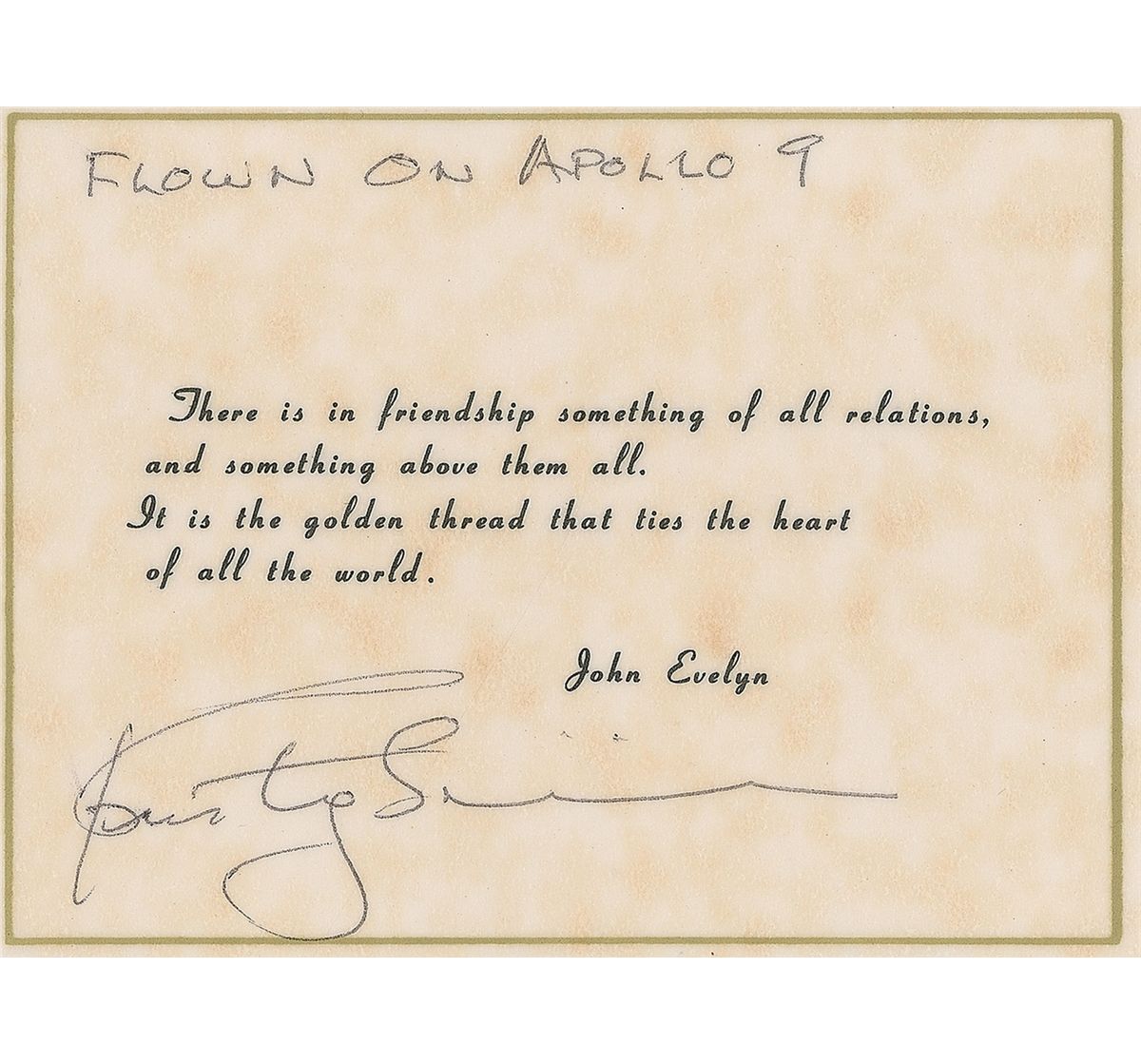 Printed poem flown on the Apollo 9 mission. The untitled poem by John Evelyn is printed on a 4 x 3 sheet of parchment-type paper. Poem reads, “There is in friendship of all relations / and something above them all / It is the golden thread that ties the heart / of all the world.” Signed in black ballpoint, “Flown on Apollo 9, Rusty Schweickart.” In very fine condition.