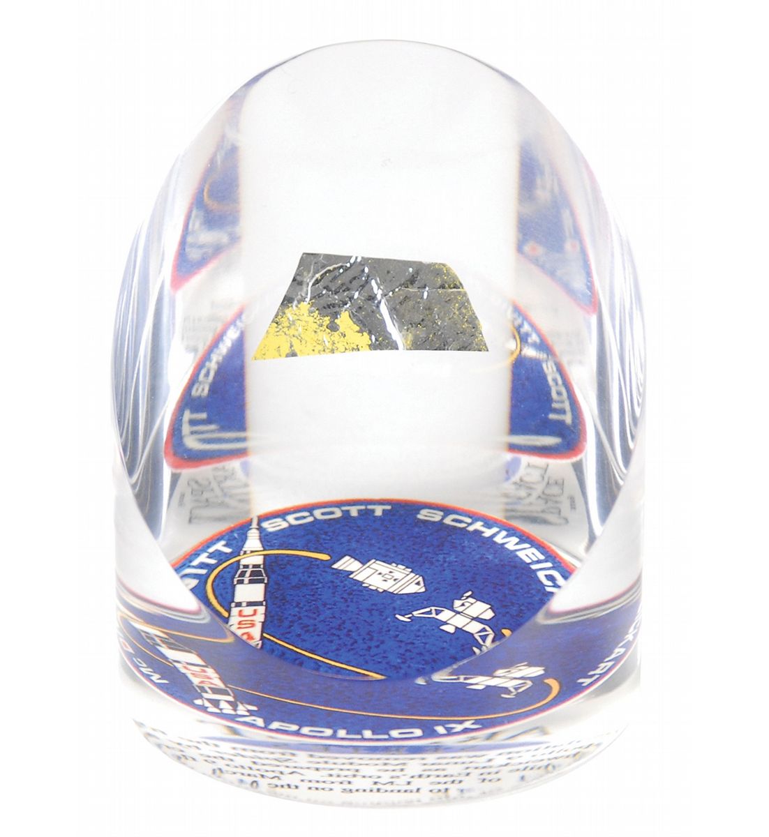 Flown Kapton foil insulation swatch, approximately 1.5 x 1, removed from the top hatch of the Apollo 9 Lunar Module Spider by Schweickart and McDivitt before the Spider was cast off into space. Encased in a cylindrical 2.75 x 3.25 piece of Lucite cut at an angle for display purposes, with an Apollo 9 emblem and certificate of authenticity at the bottom. Originally distributed through the Astronaut Scholarship Foundation. In fine condition, with a couple chips to the Lucite. Accompanied by a matching certificate of authenticity signed by astronaut Rusty Schweickart certifying that it is a piece from his personal collection.