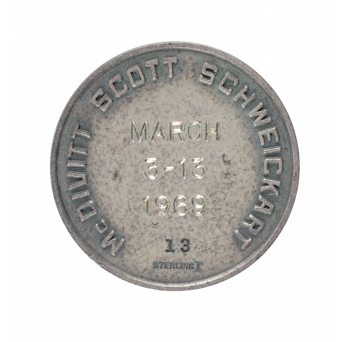 Flown sterling silver Apollo 9 Robbins medal, with a raised design of the mission insignia on the face, approximately 1? in diameter, engraved with the mission dates on the reverse, “March 3–13, 1969,” encircled by the names of the astronauts in raised text. The medal is serial numbered “13” and includes its original matching case, with the foam material inside disintegrating. Condition is normal with light toning. Accompanied by a signed letter of provenance from Dave Scott, in part: “I hereby certify that the Apollo 9 silver medallion number ‘13’ included with this letter is from my personal collection and was flown aboard Apollo 9, March 3–13, 1969. I was Command Module Pilot on Apollo 9…I specifically requested the Apollo 9 number ‘13’ included with this letter.”