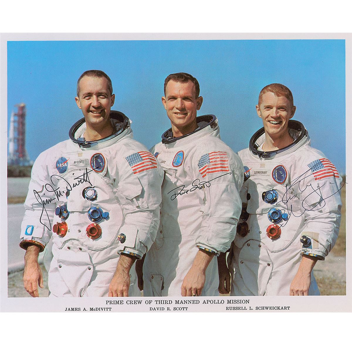 Color official NASA 10 x 8 lithograph of the Apollo 9 crew posing in their white space suits, signed in black felt tip by Jim McDivitt and Dave Scott, and in black ink by Rusty Schweickart. In fine condition.