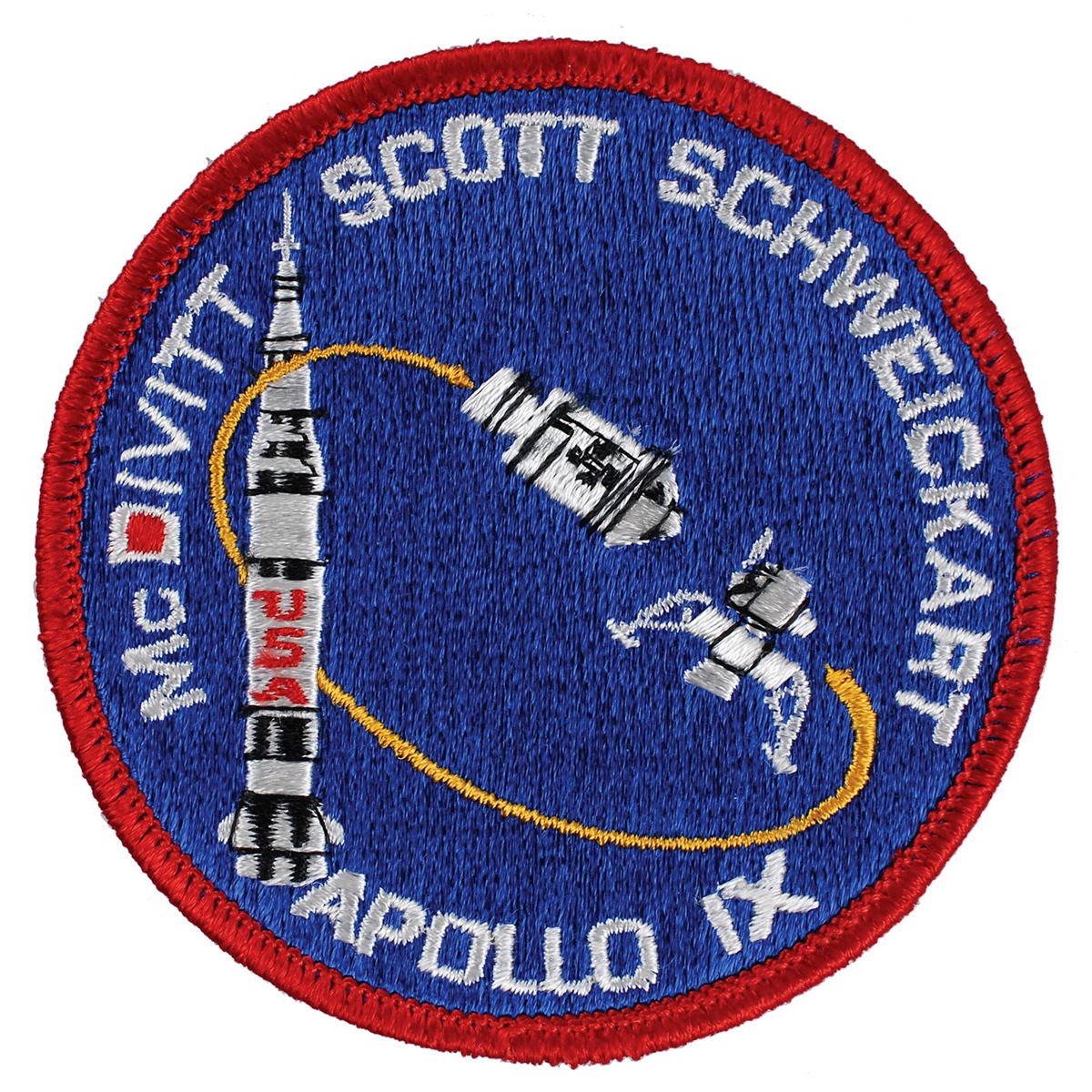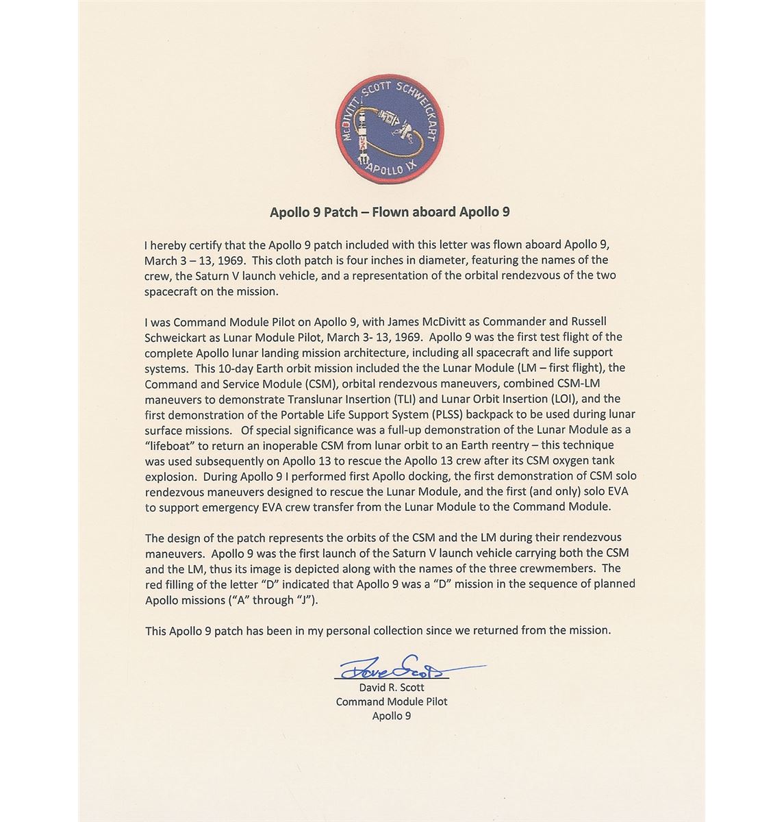 Flown embroidered Apollo 9 mission patch, measuring 3.5? in diameter, signed and flight-certified on the reverse in blue felt tip, “Flown on Apollo 9, Dave Scott CMP.” In fine condition. Accompanied by a signed letter of authenticity from Scott, in part: “I hereby certify that the Apollo 9 patch included with this letter was flown aboard Apollo 9, March 3–13, 1969…This Apollo 9 patch has been in my personal collection since we returned from the mission.”