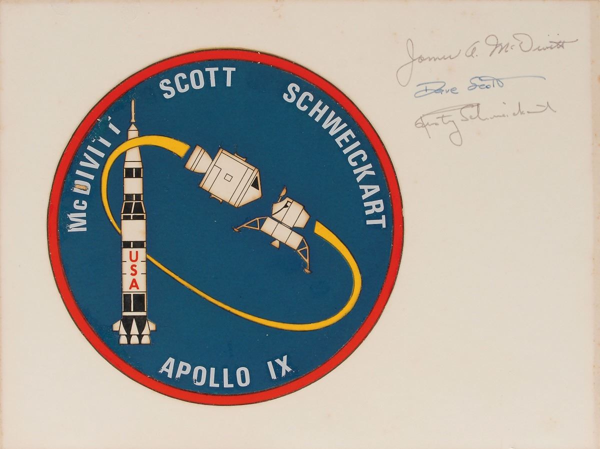 Felt tip signatures, “James A. McDivitt,” “Dave Scott,” and “Rusty Schweickart,” on an off-white 12 x 9 heavyweight card bearing a large affixed Apollo 9 emblem. In fine condition, with toning to edges and three small areas of surface loss along the top edge.