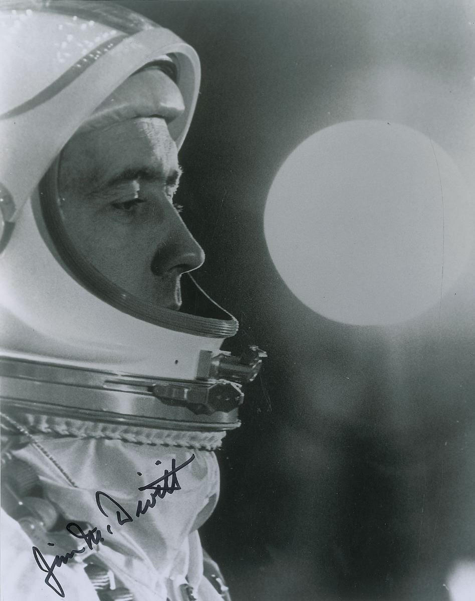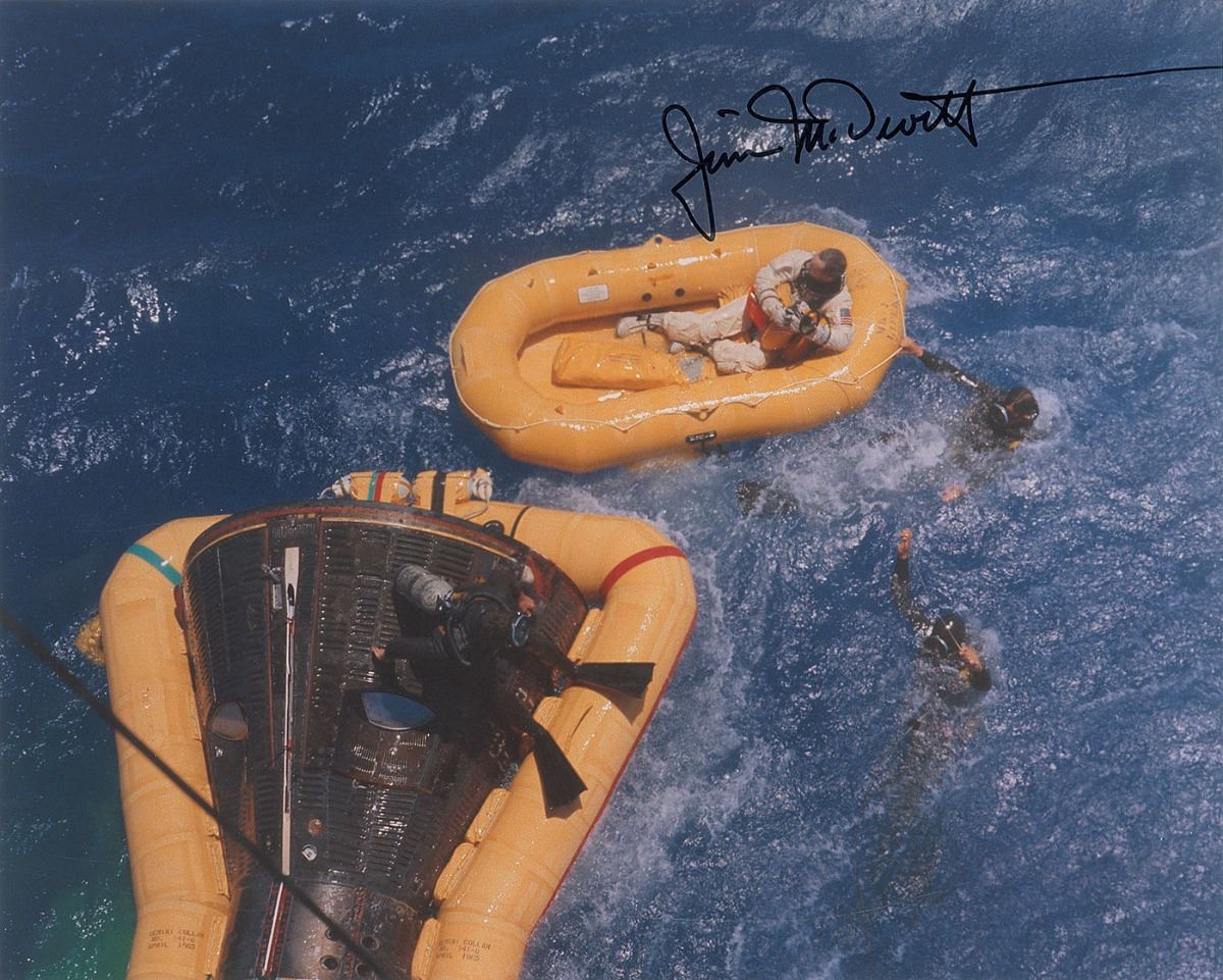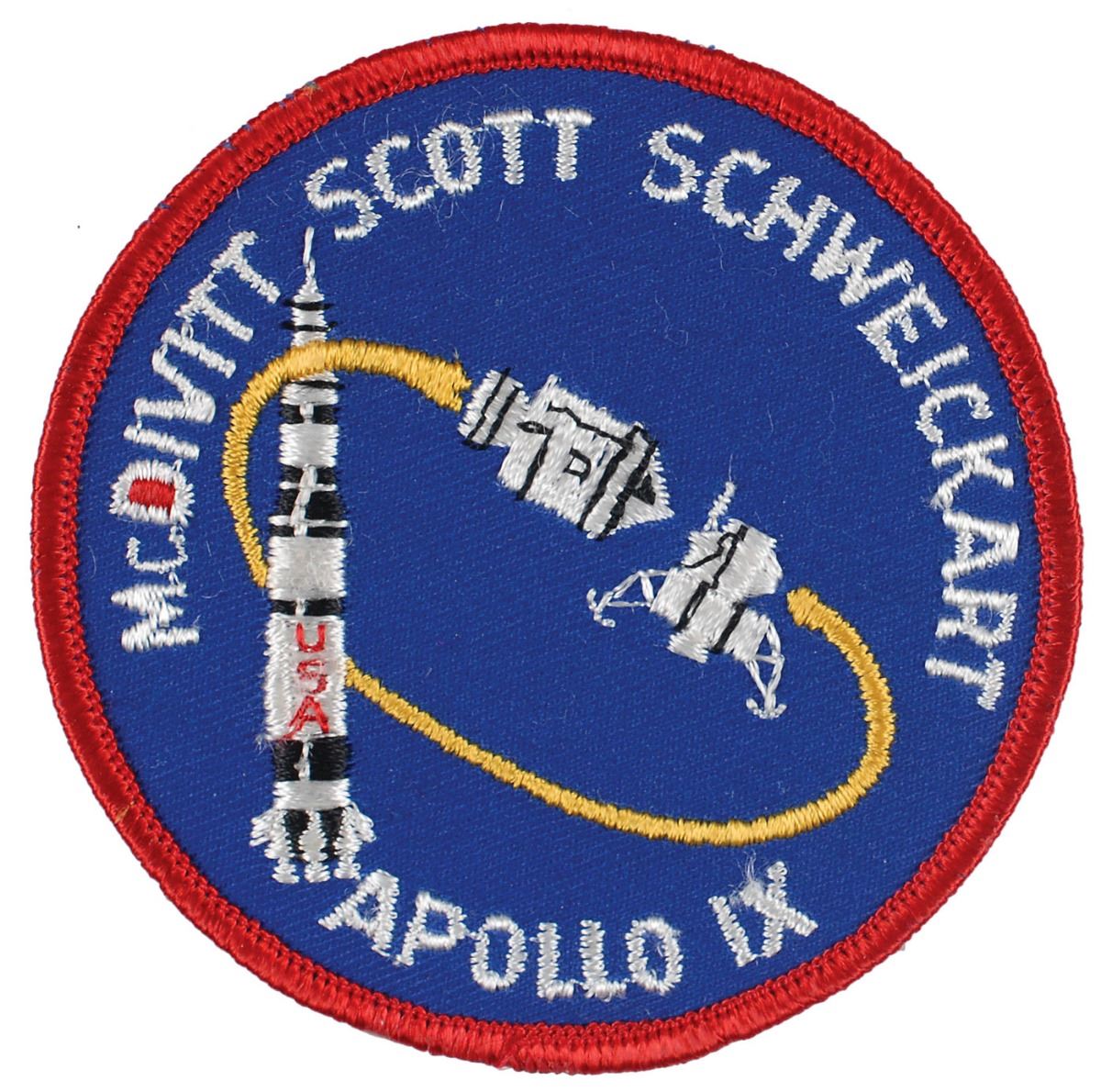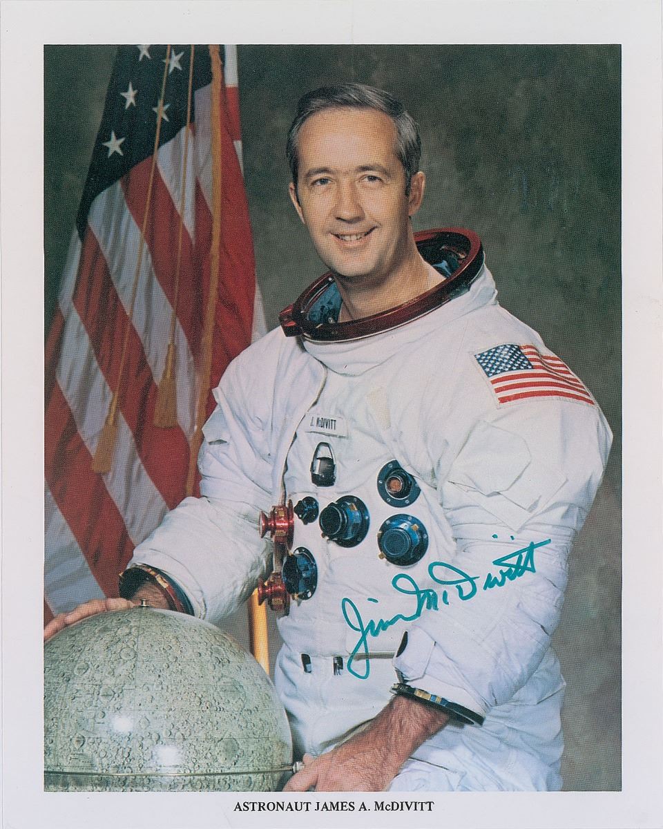 Collection of seven items, including: four photos depicting Jim McDivitt at various points of the Apollo 9 mission, 8 x 10 and 10 x 8, each signed in felt tip by McDivitt; two official 8 x 10 NASA lithographs of Rusty Schweickart posing in his white space suit, each signed in black ink; and a scarce embroidered Apollo 9 ‘crew souvenir’ mission patch, measuring 3.5? in diameter. In overall fine condition.