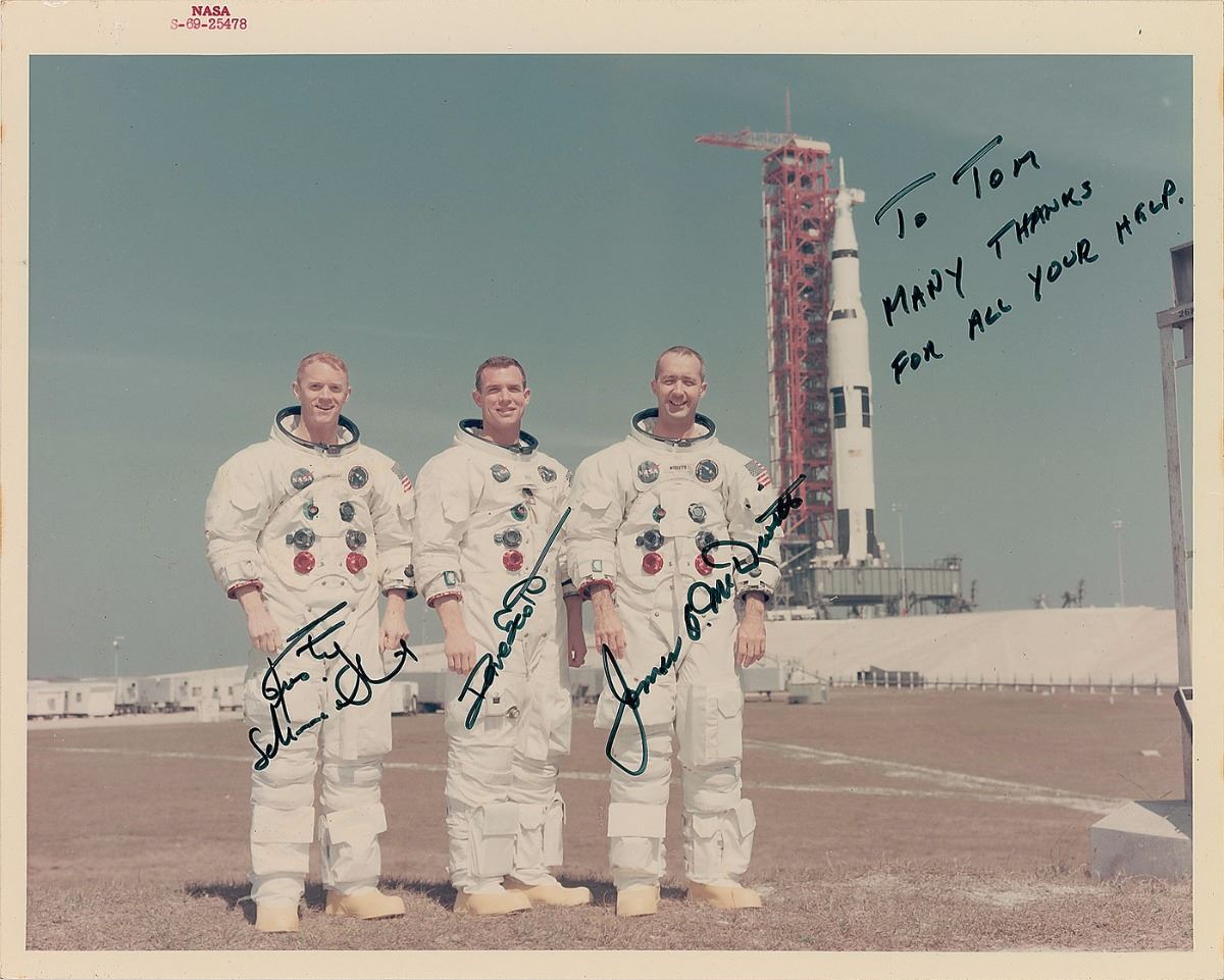 Official color glossy 10 x 8 NASA red-numbered photo of the Apollo 9 crew posing in their white space suits with the Saturn rocket resting in its tower in the background, signed and inscribed in black felt tip, “To Tom, many thanks for your help, James A. McDivitt,” “Dave Scott,” and “Rusty Schweickart.” In fine condition. Pre-certified Zarelli Space Authentication.