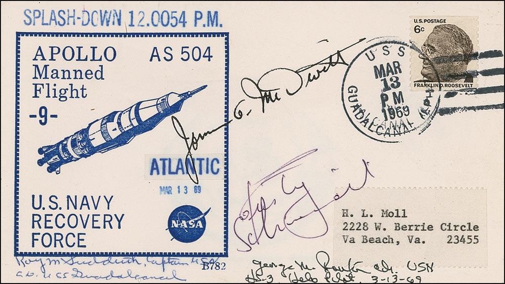 Apollo 9 Prime Recovery ship postal cover with a cachet honoring the Apollo 9 naval recovery force, signed in black felt tip and ink by James McDivitt and Rusty Schweikart, as well as two members of the recovery force. In fine condition, with a small address label affixed to lower right. Pre-certified Scott Cornish and RRAuction COA.
