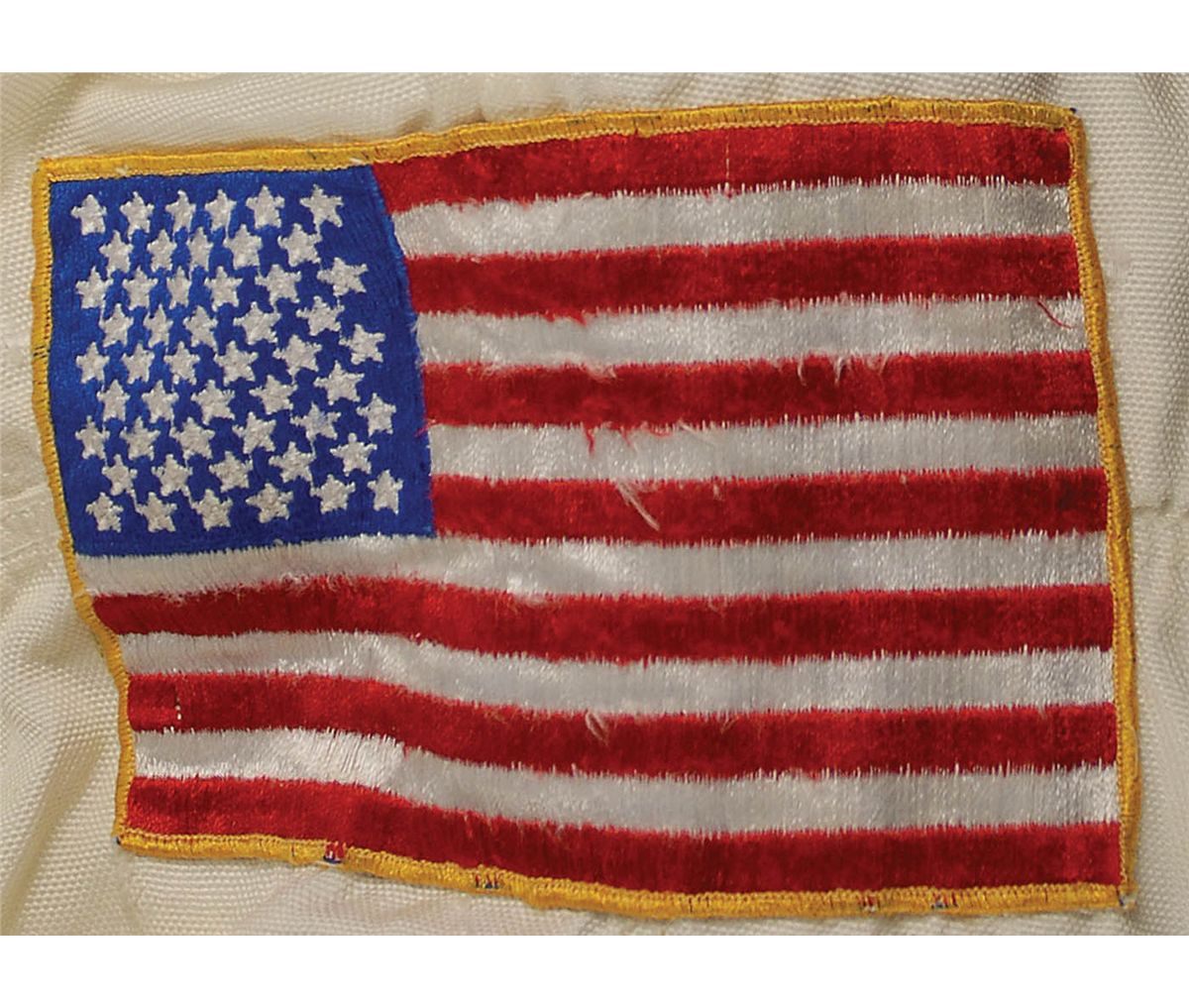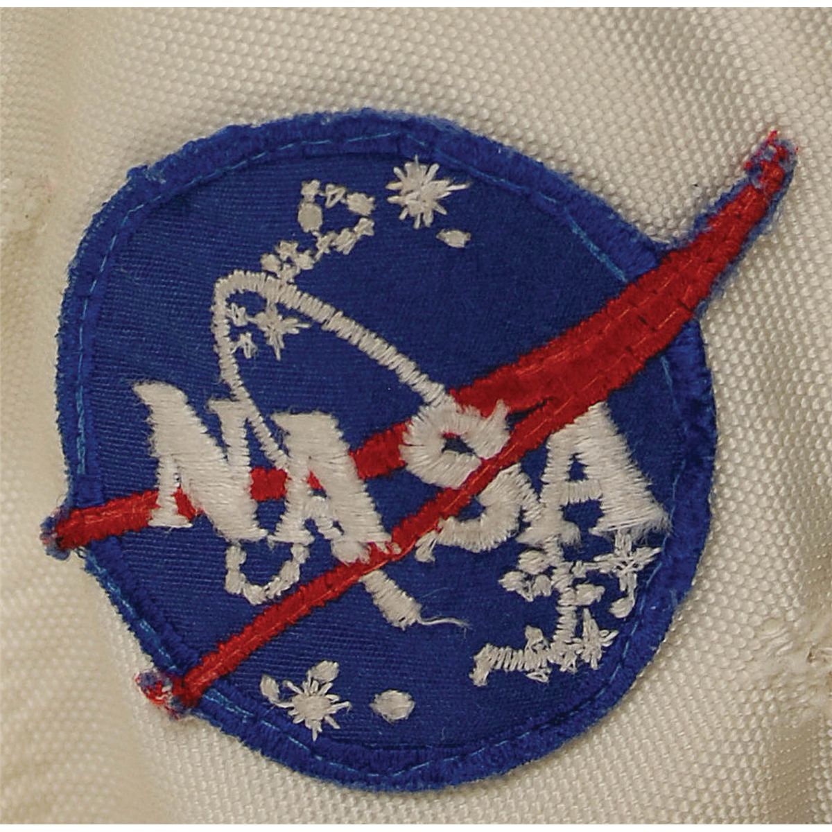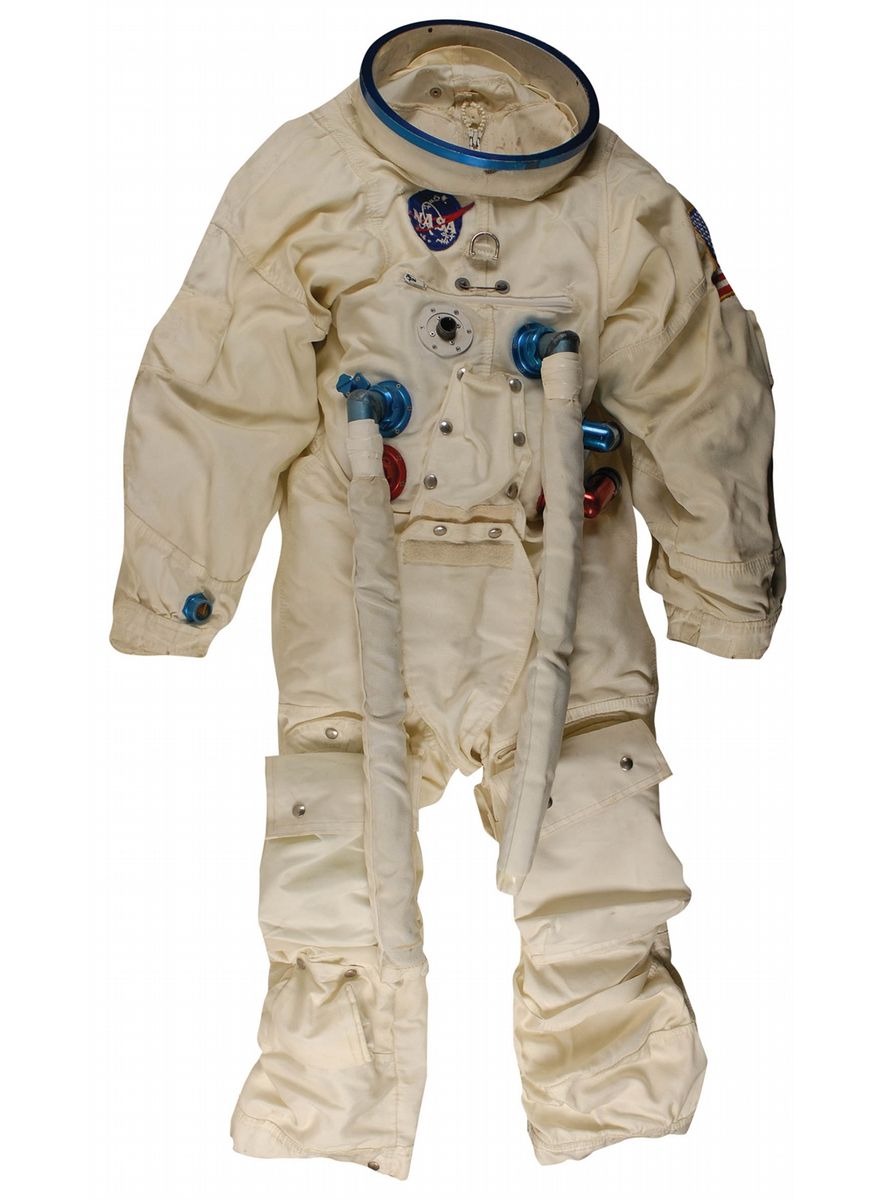 Fantastic and very detailed NASA KSC PAO contracted (by blueprint) high fidelity, model mock-up of the Apollo A7L spacesuit. The one-piece off-white suit has the blue helmet collar, blue and red flanges, connectors, and two hoses, detachable utility and checklist pockets on the legs, zipper pocket on the chest, penlight pocket on the left arm, and a NASA and American flag patch. This suit was used by NASA PAO for public educational, space center lobby displays, and at the KSC's Spaceport USA now known as KSCVC. Just about as close to acquiring a real NASA space suit as you can get.