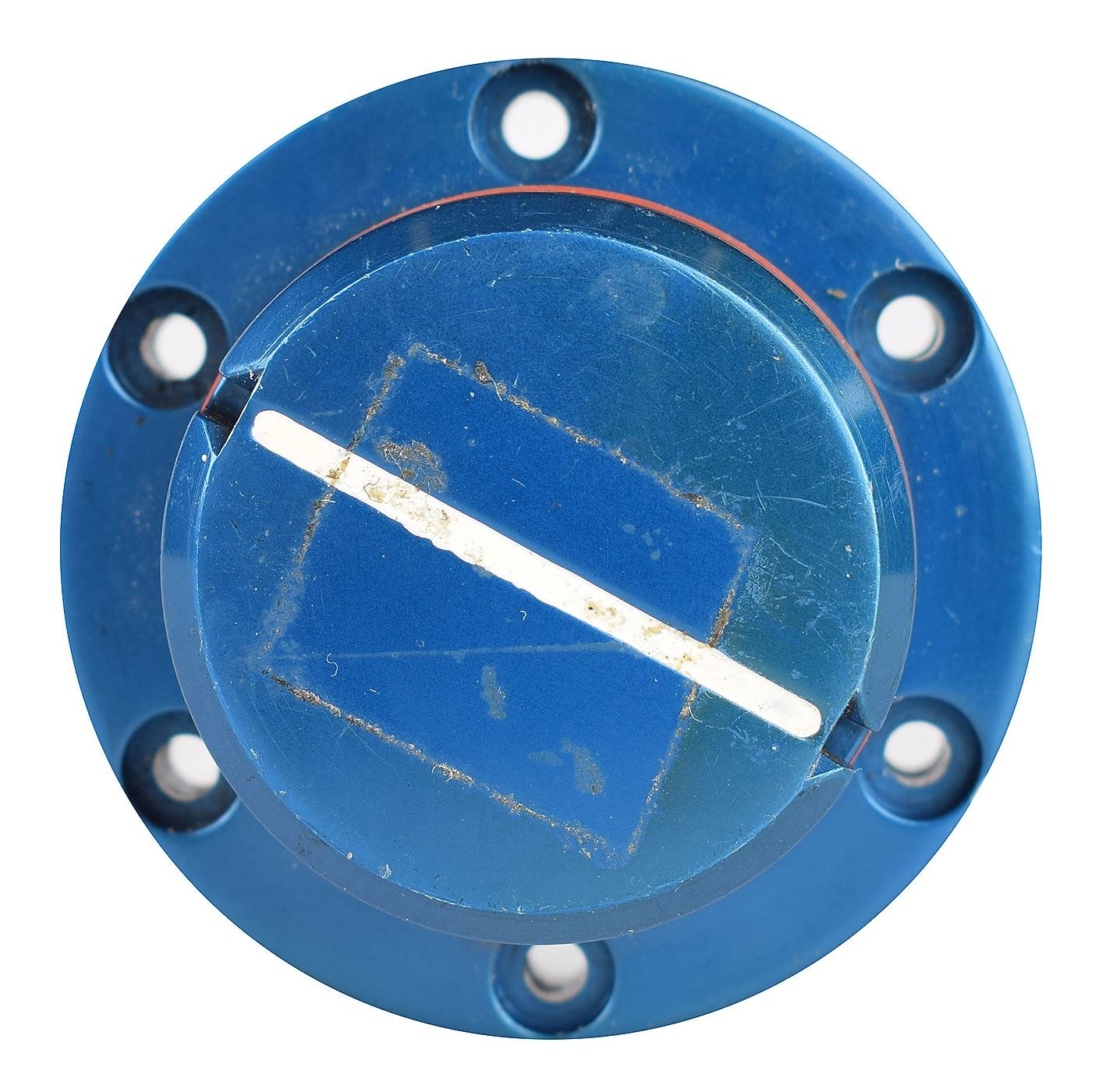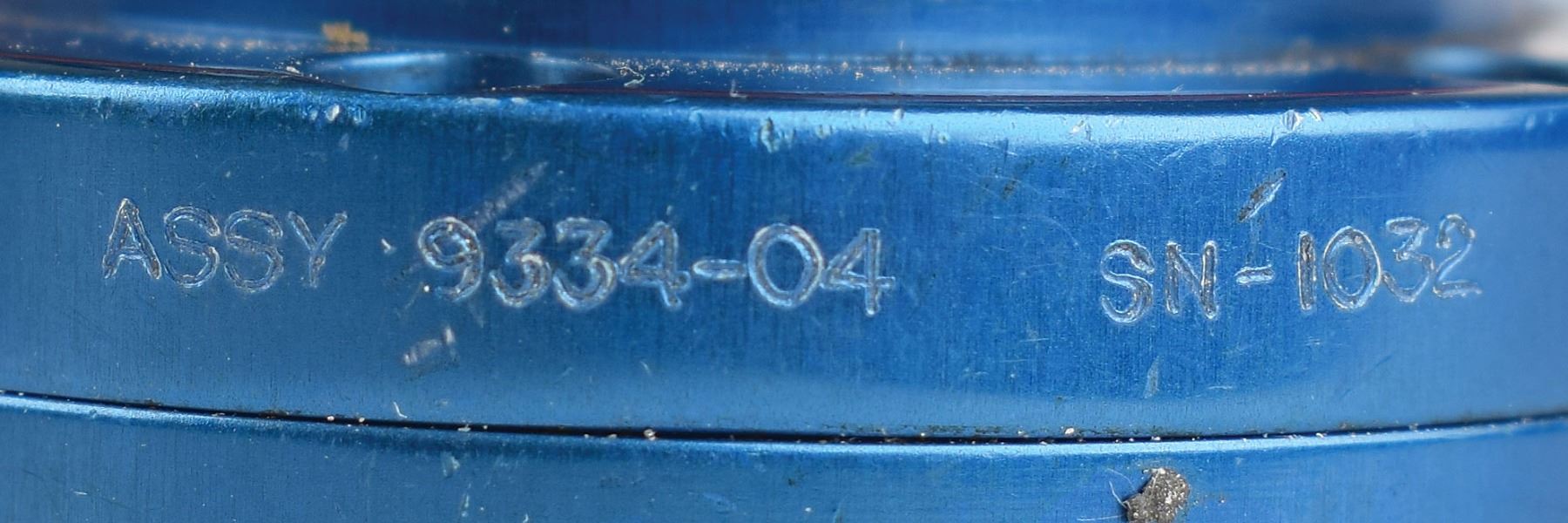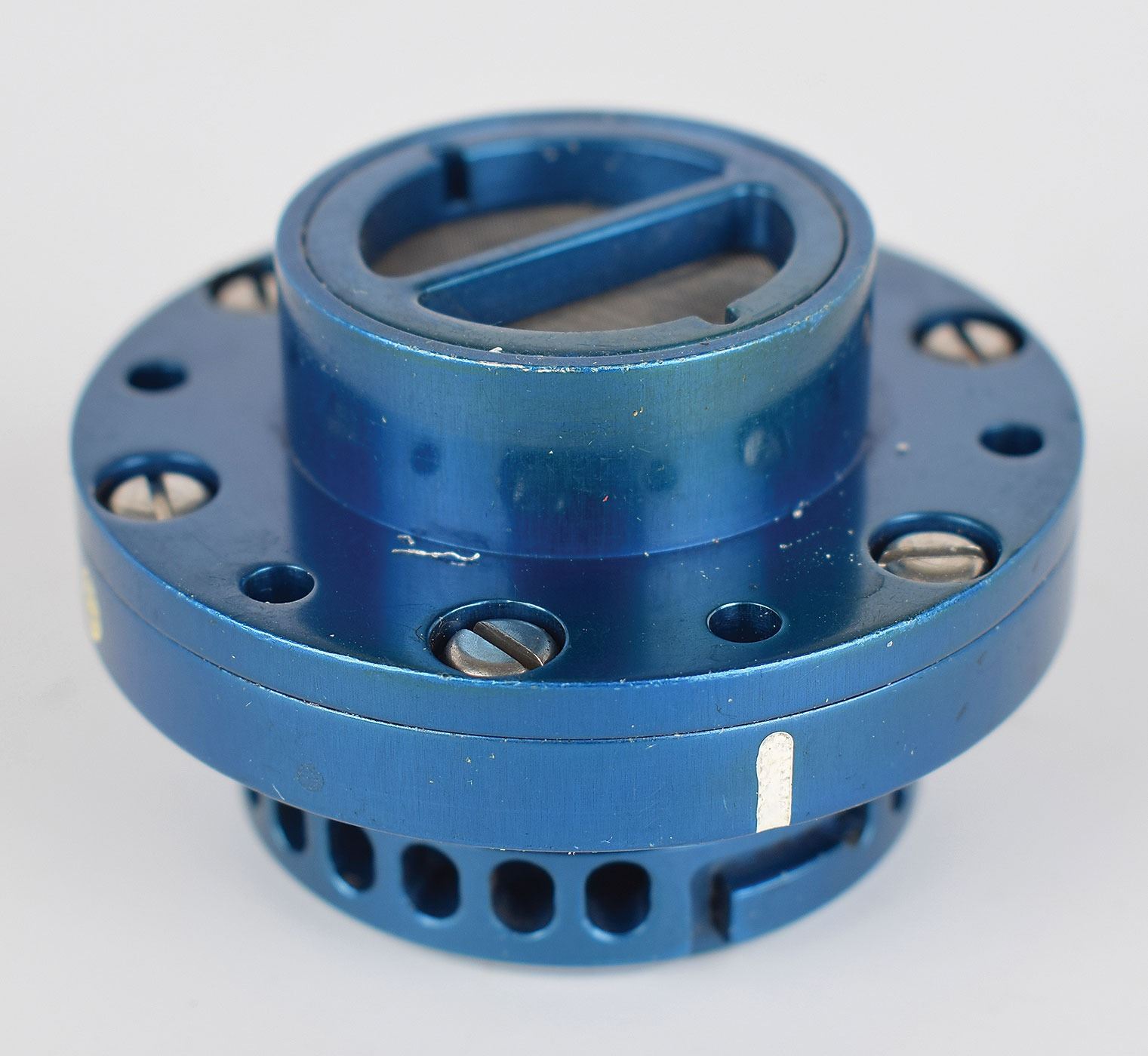 Apollo A7LB space suit pressure relief valve, measuring 2? in diameter and 1.25? tall, engraved on the edge with part numbers, "ASSY 9334-04, SN-1032, A7LB-109049-01." Manufactured by Air-Lock, the blue anodized valve was used to vent gas from the suit should an over-pressure condition happen when the crewmember was pressurized in the suit. It was set to open somewhere between 4.6 to 5.4 pounds per square inch. The Apollo suit operated at a nominal pressure of 3.75 pounds per square inch. In fine condition, with a small piece of tape affixed to the top of the valve.
